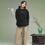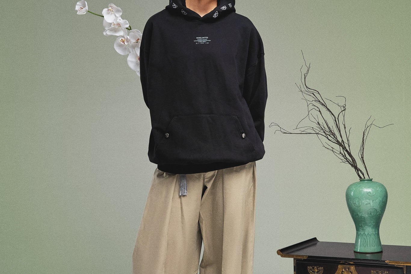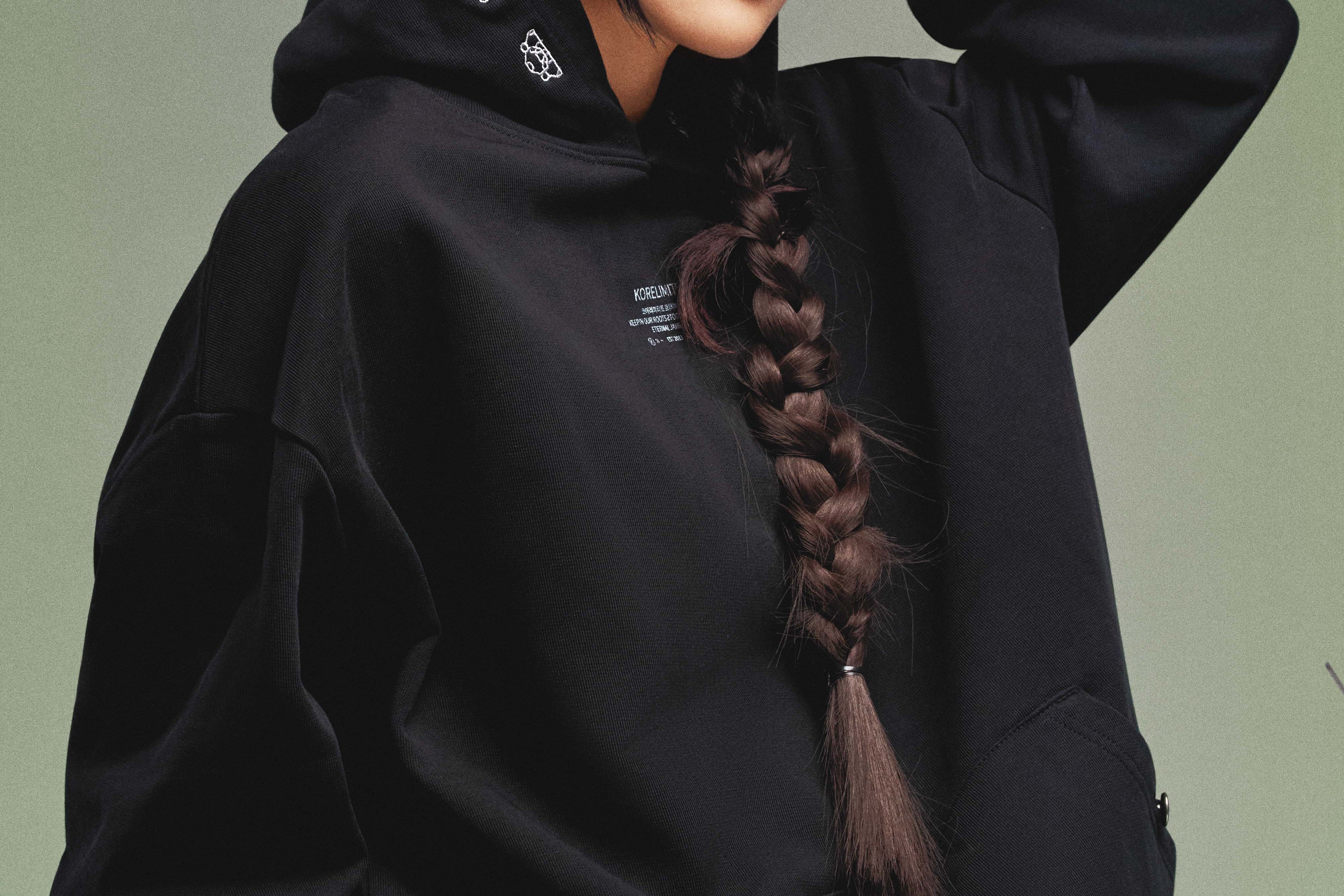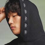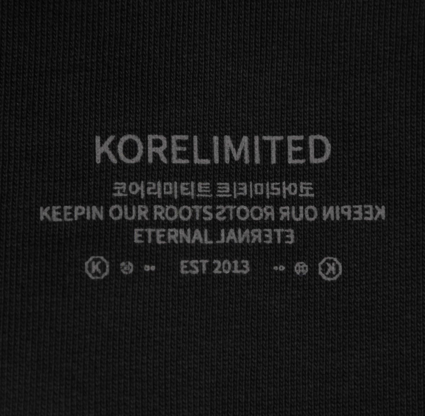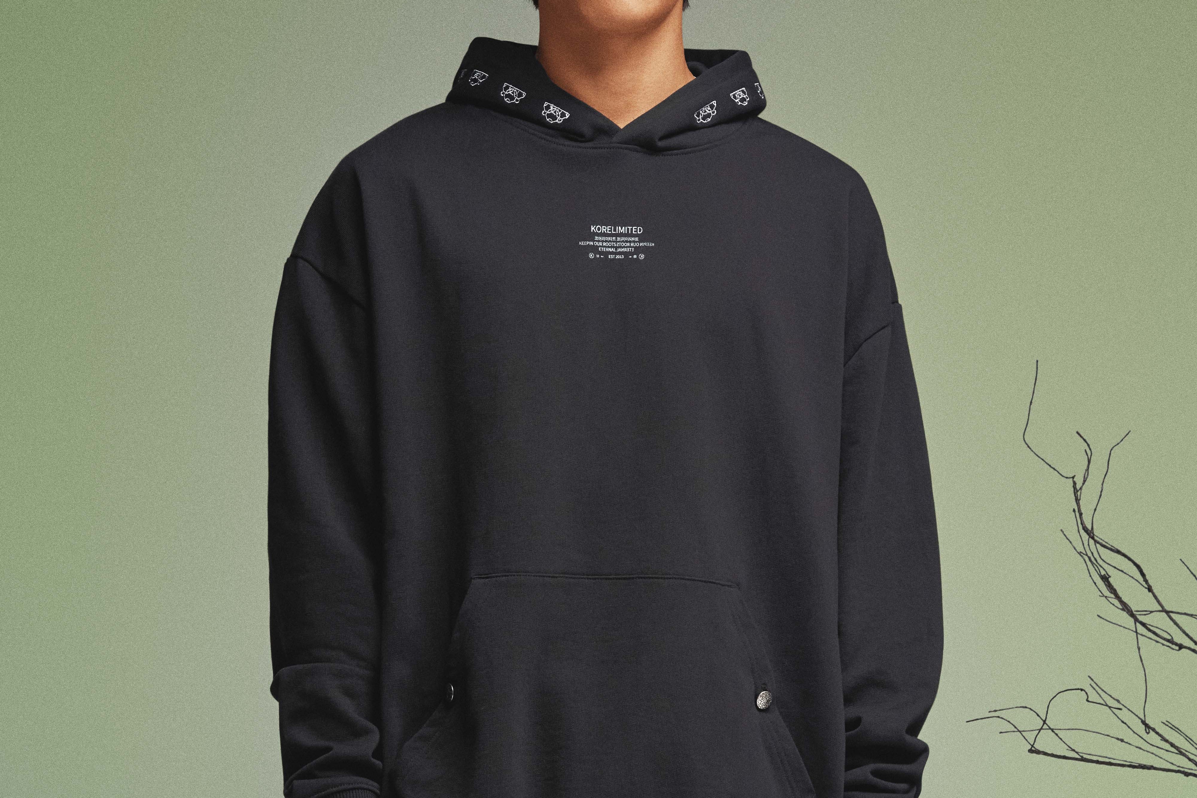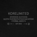 The KORELIMITED Buttoned Pocked Hoodie in Black features the iconic Korelimited logo and "KEEPIN OUR ROOTS" text on the front chest, complemented by a unique, traditional Korean-inspired pattern lace design along the hoodie outline,, and button-closure pockets. A perfect fusion of heritage and modern streetwear. Also available in navy.