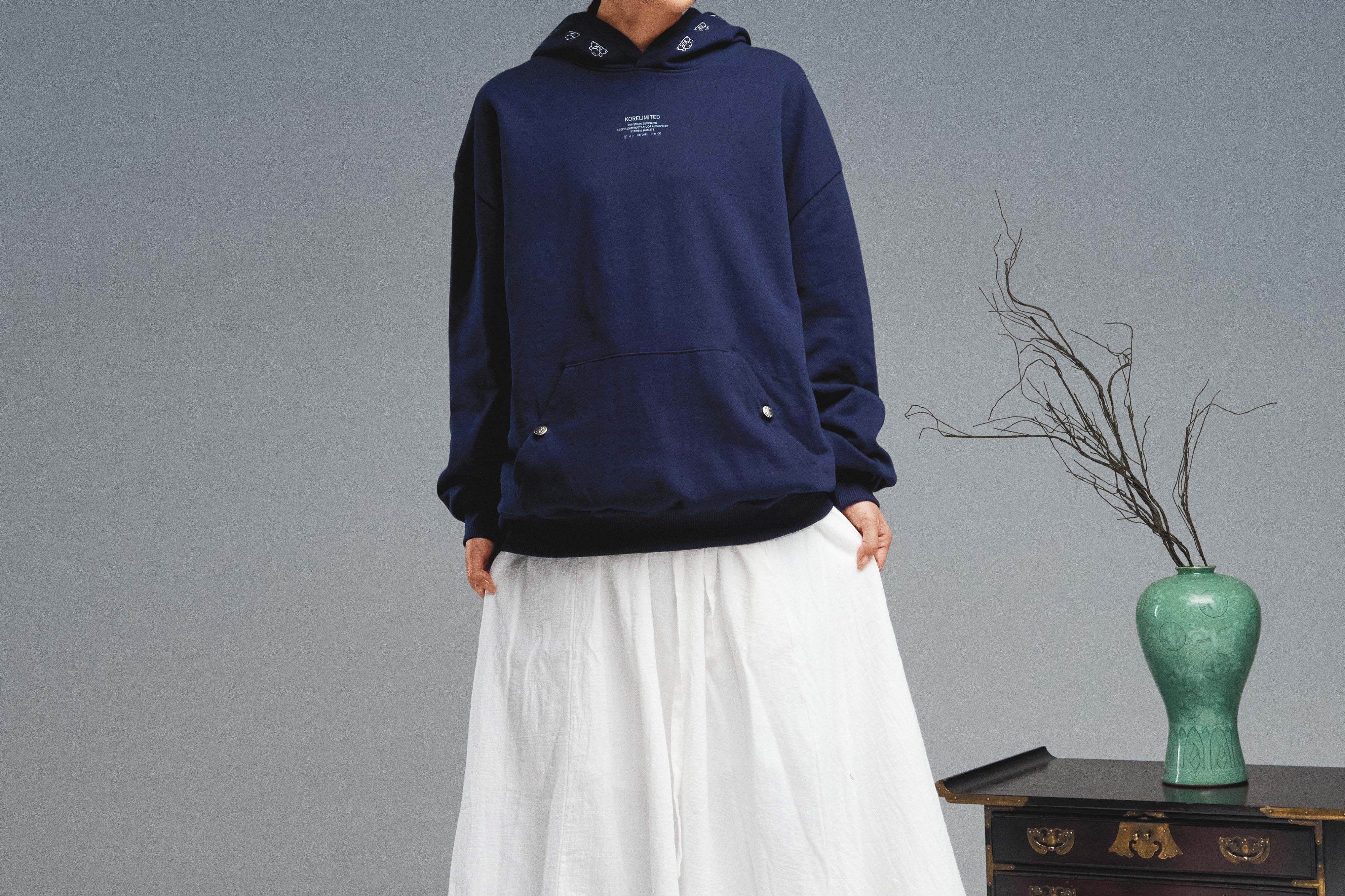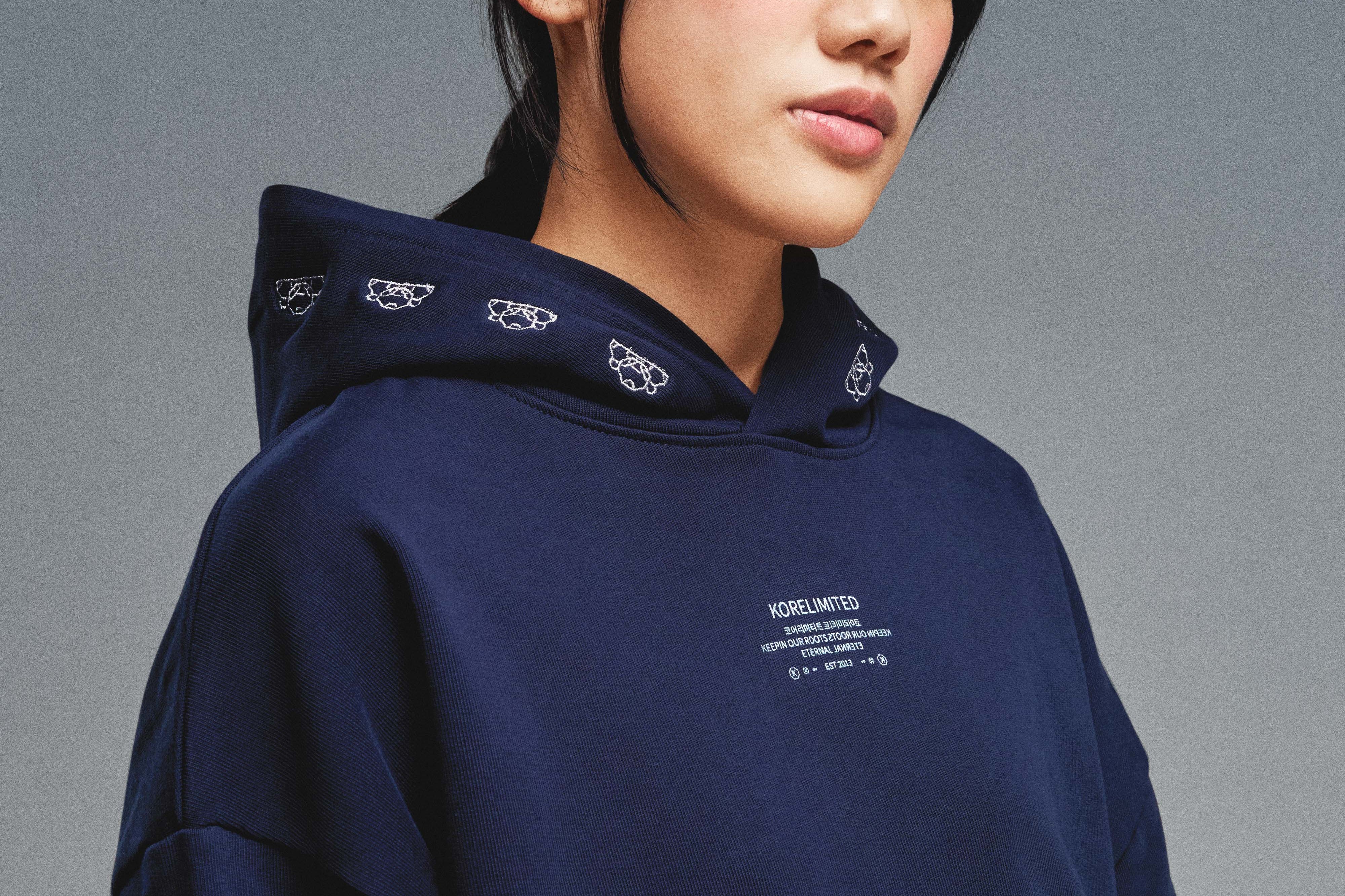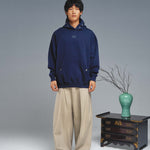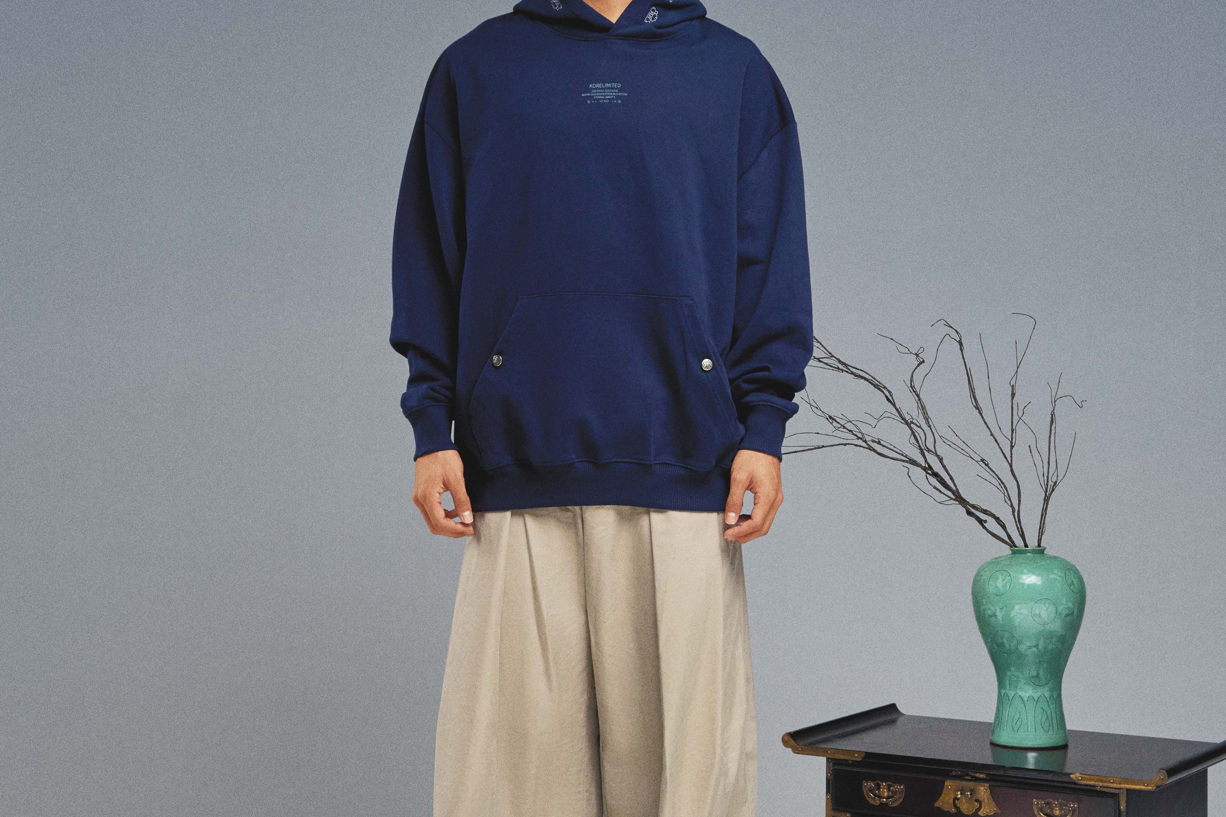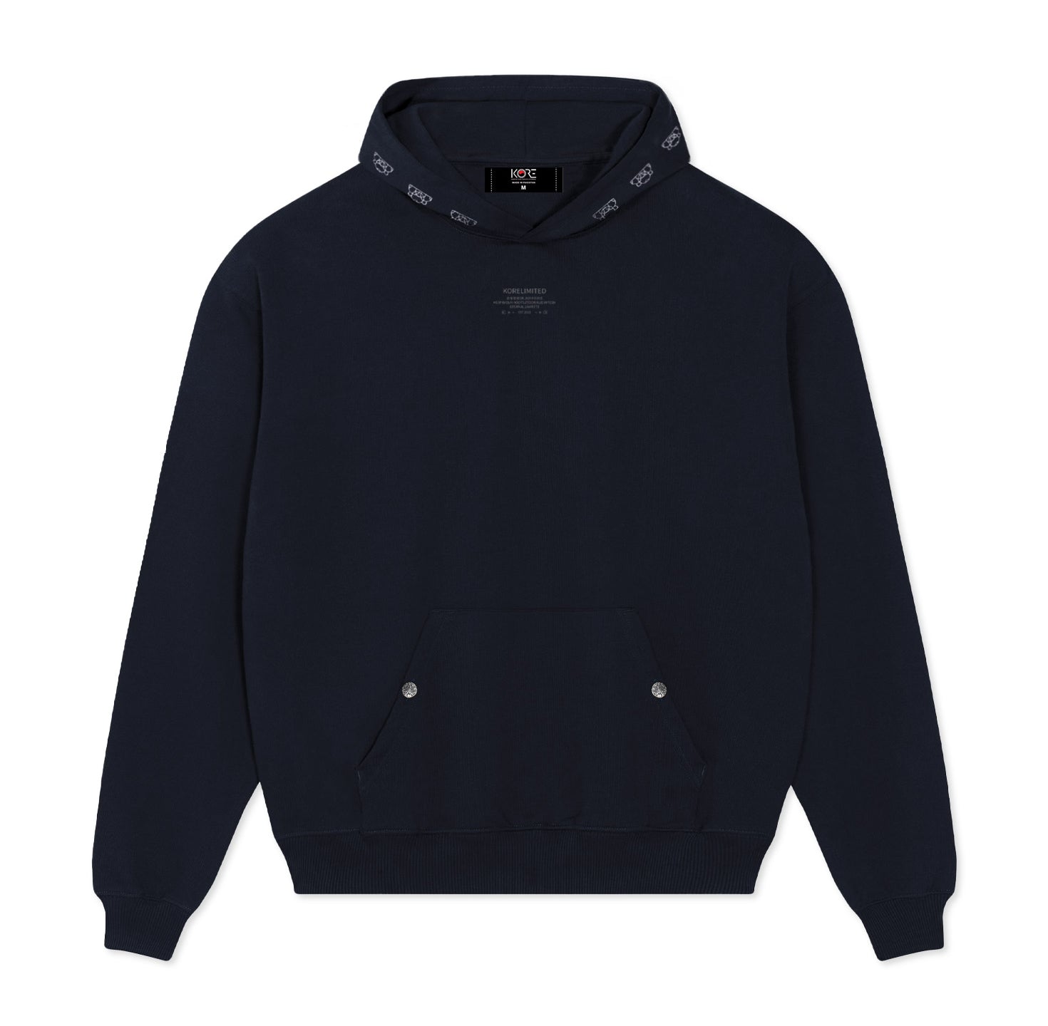 The KORELIMITED Buttoned Pocket Hoodie in Navy celebrates Korean heritage through intricate lace detailing along the hood and “KEEPIN OUR ROOTS” branding on the front. Designed with buttoned pockets for a sleek, street-ready look. Available in Black as well.