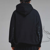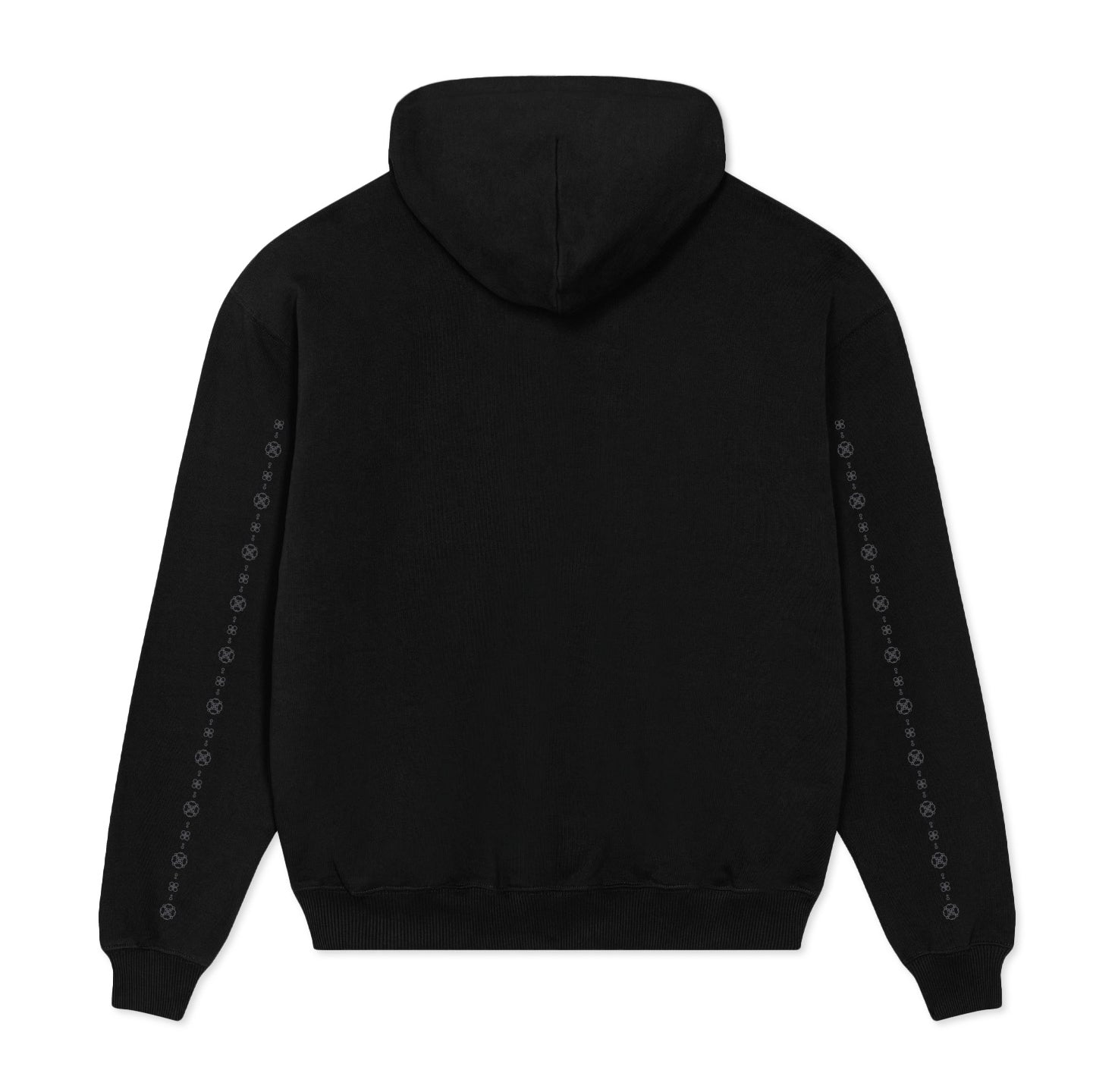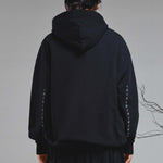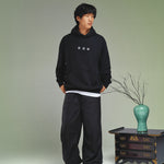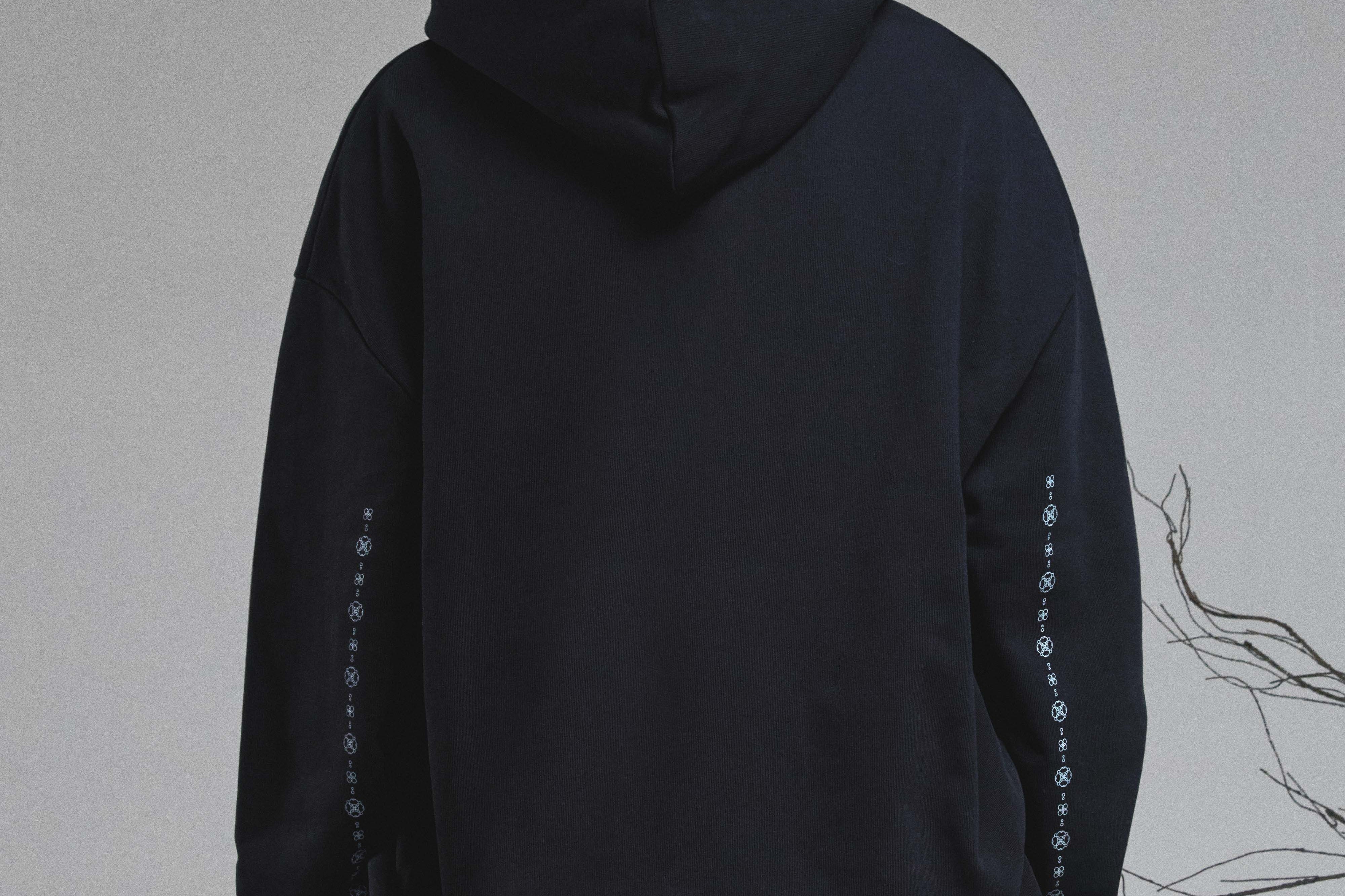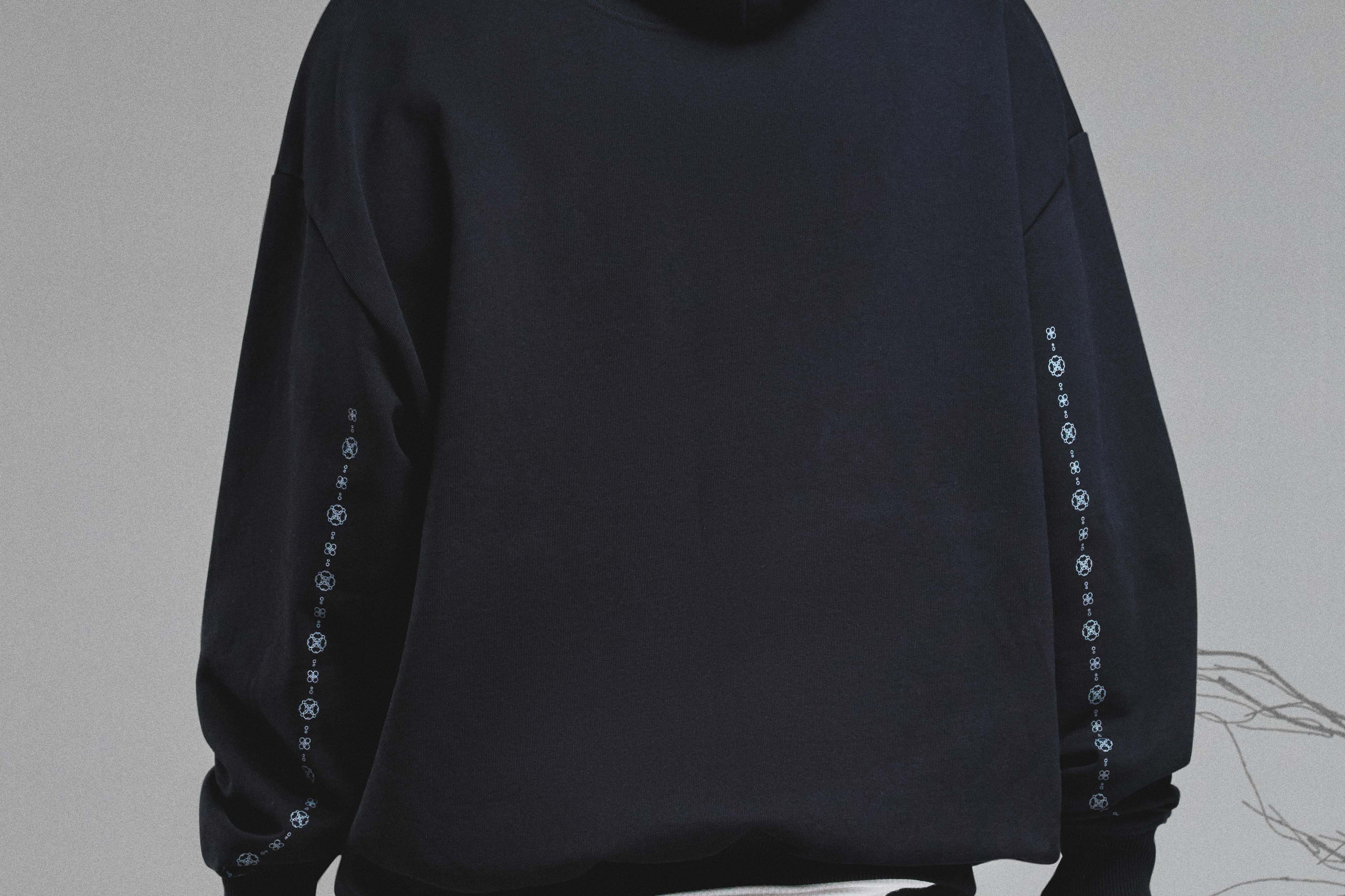 The Flower Line Arm Hoodie in Black is a unique design featuring a continuous, traditional Korean flower pattern running down the arm. A stylish blend of heritage art and modern streetwear comfort. Also available in white.