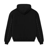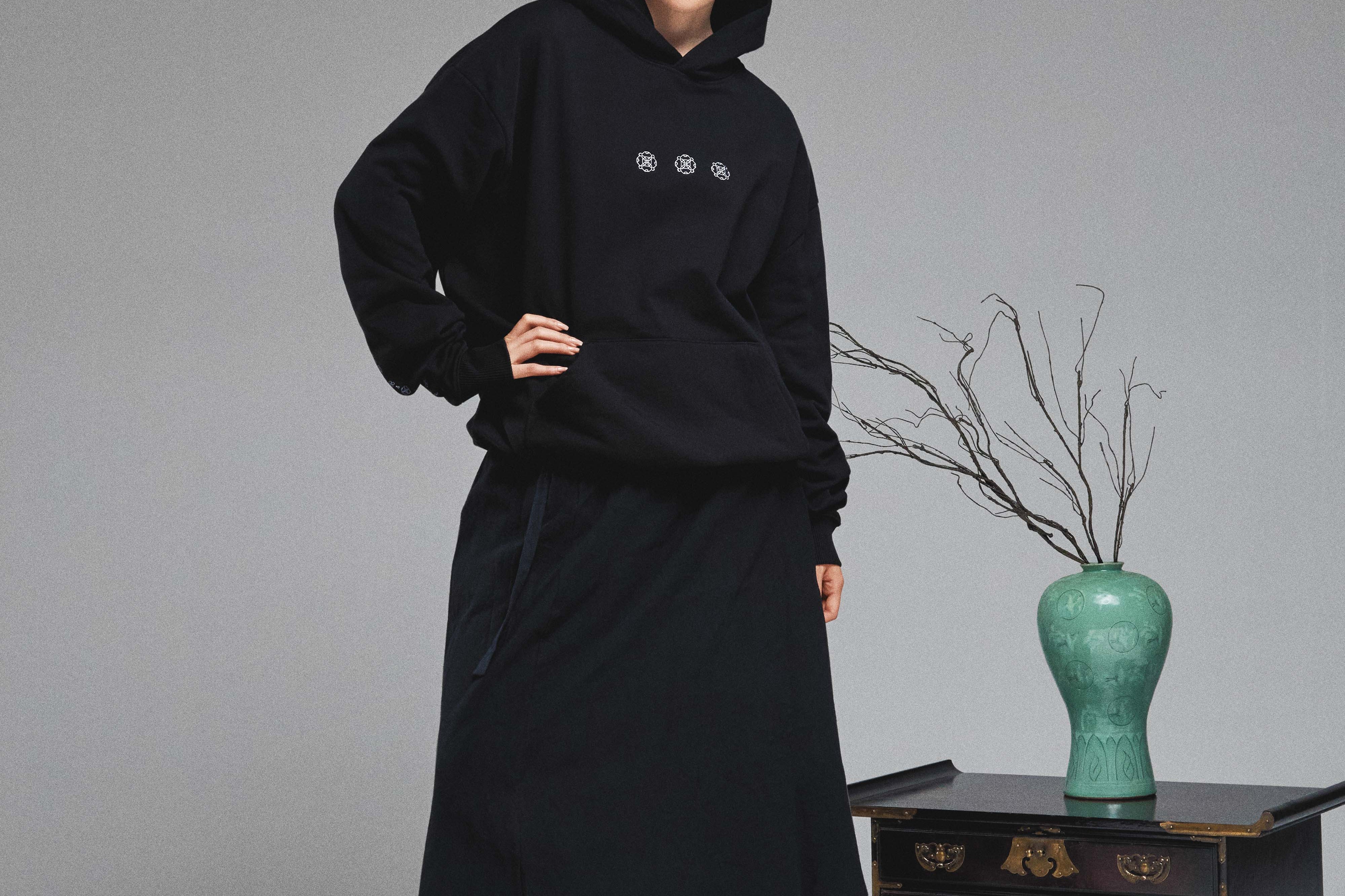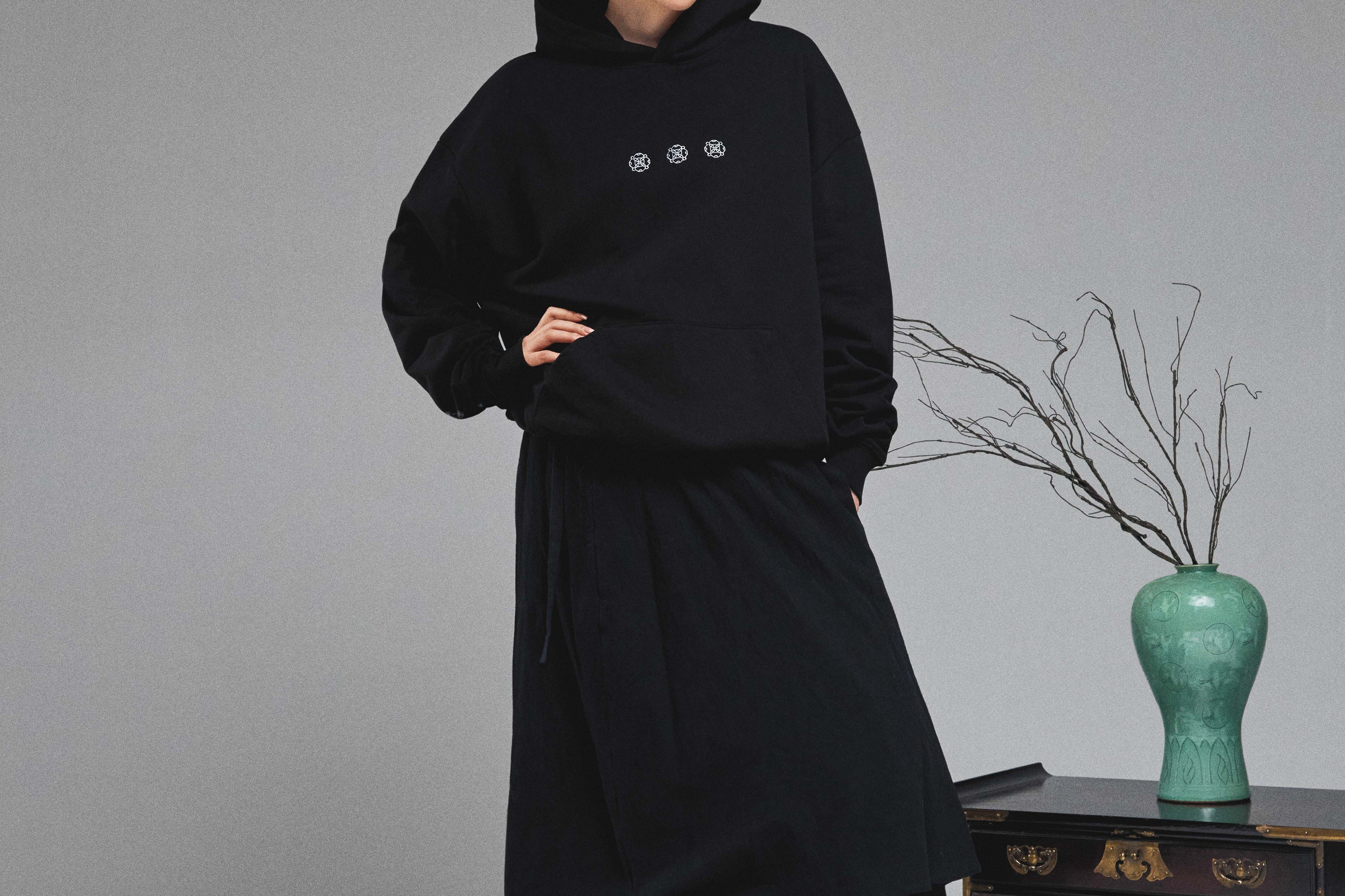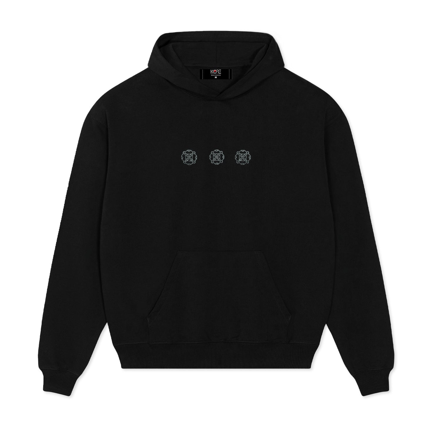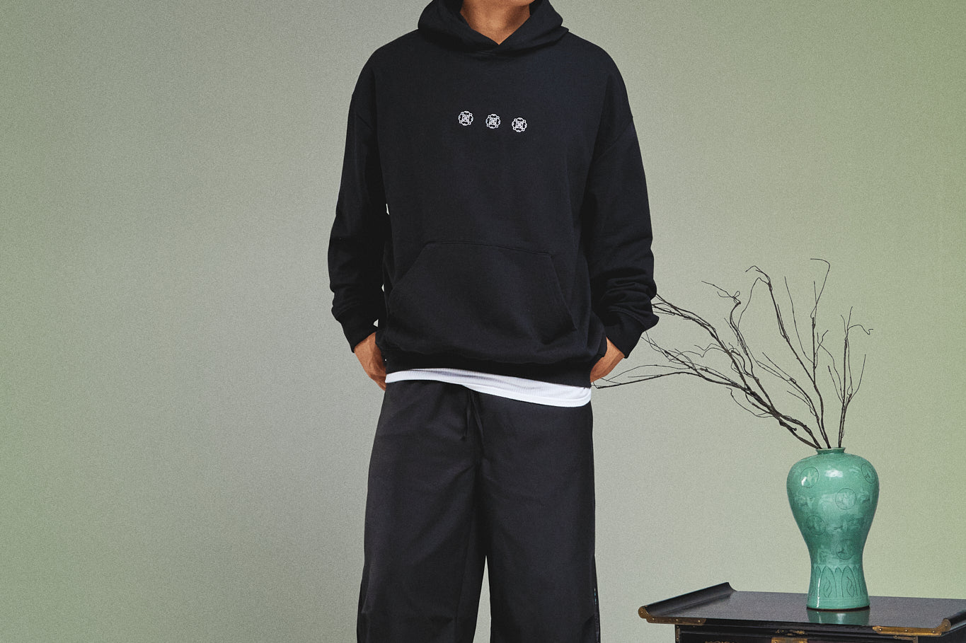 The Flower Line Arm Hoodie in Black is a unique design featuring a continuous, traditional Korean flower pattern running down the arm. A stylish blend of heritage art and modern streetwear comfort. Also available in white.