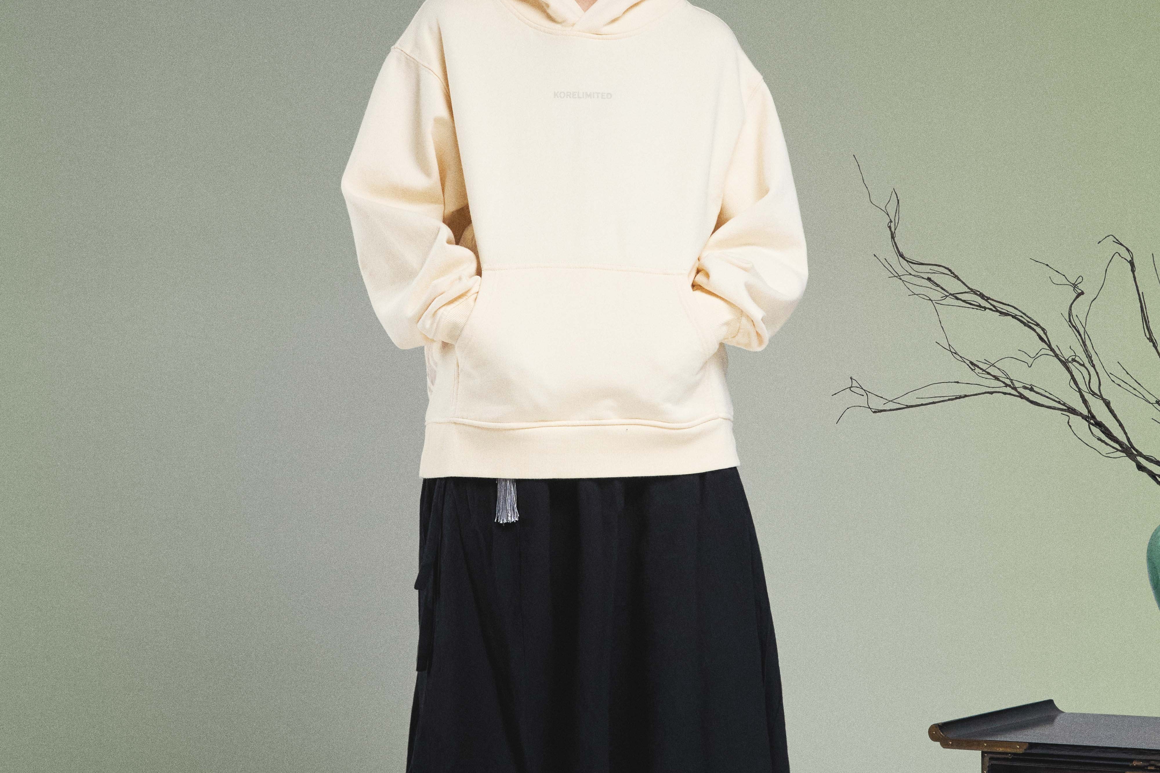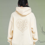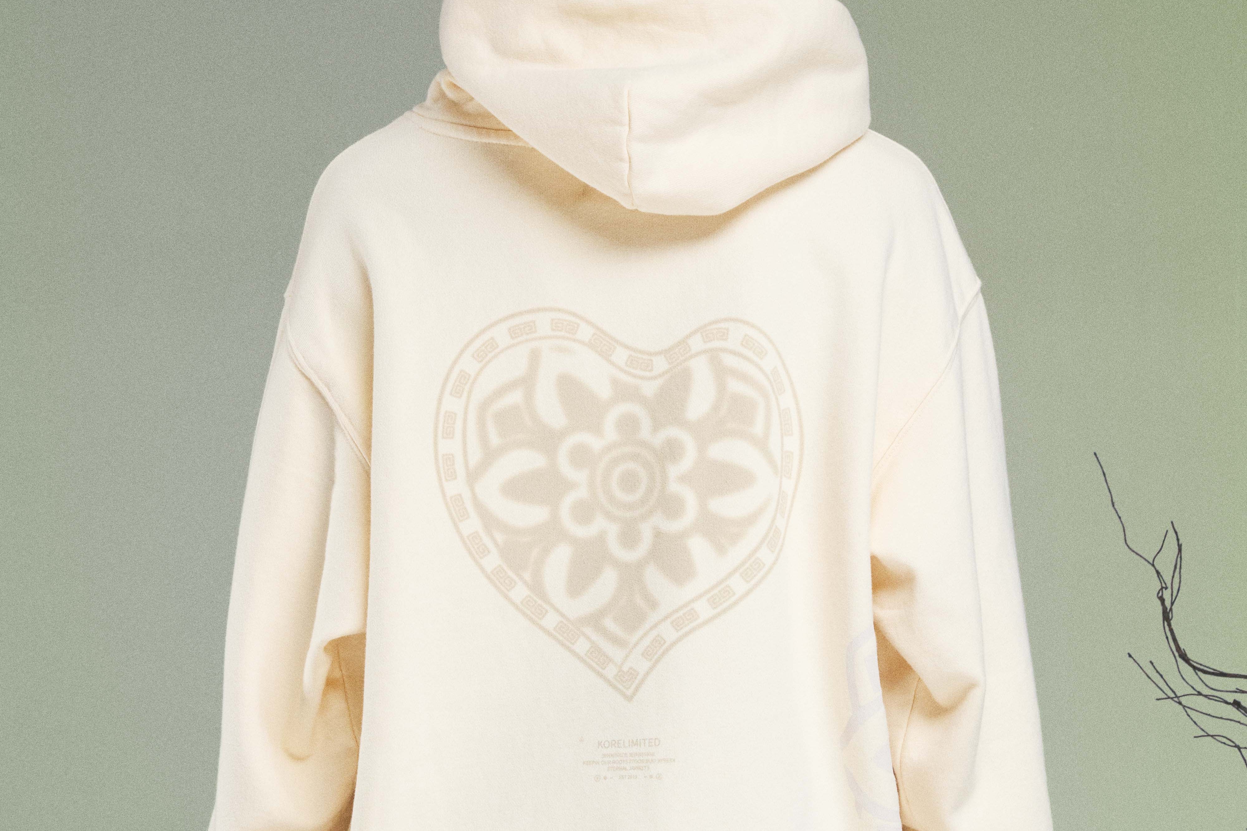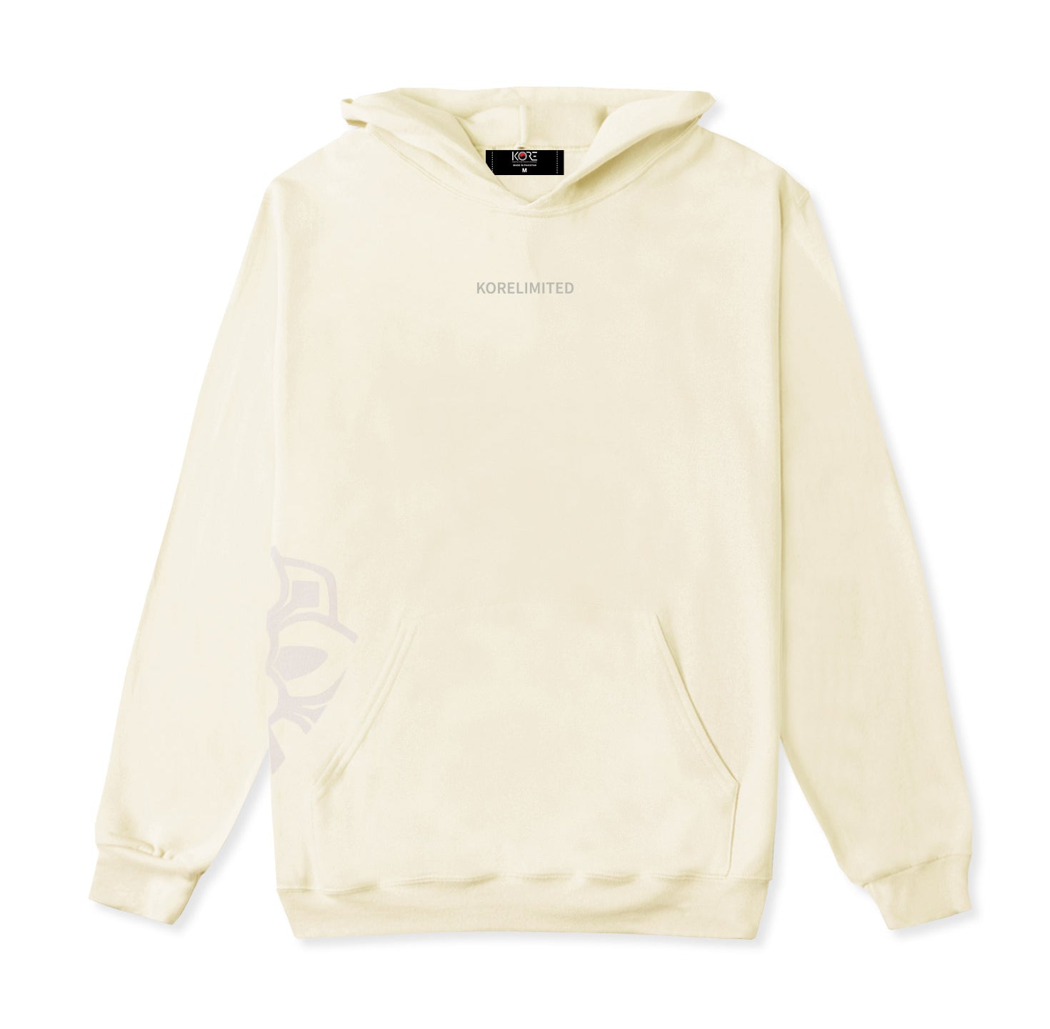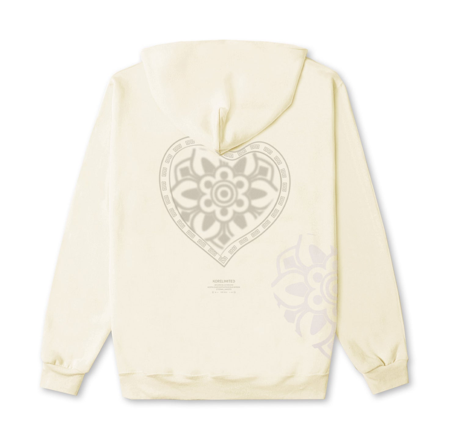 The KORELIMITED Hidden Heart Hoodie in Cream features the signature 'KORELIMITED' logo on the front and a striking heart design on the back and side front. With a traditional Korean motif inside the heart, this hoodie merges contemporary streetwear with cultural heritage. Available in Black as well
