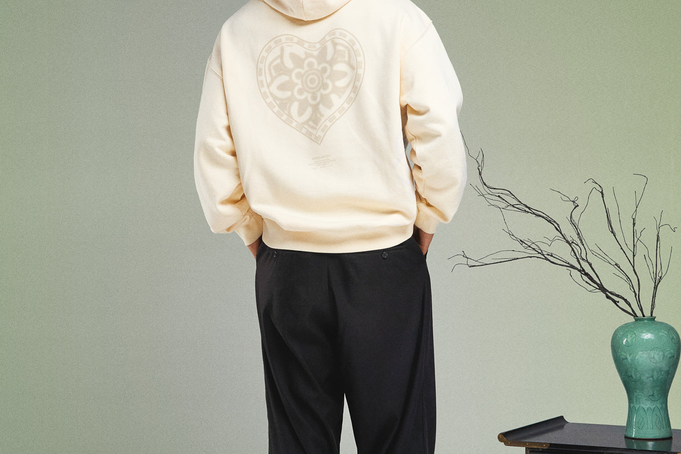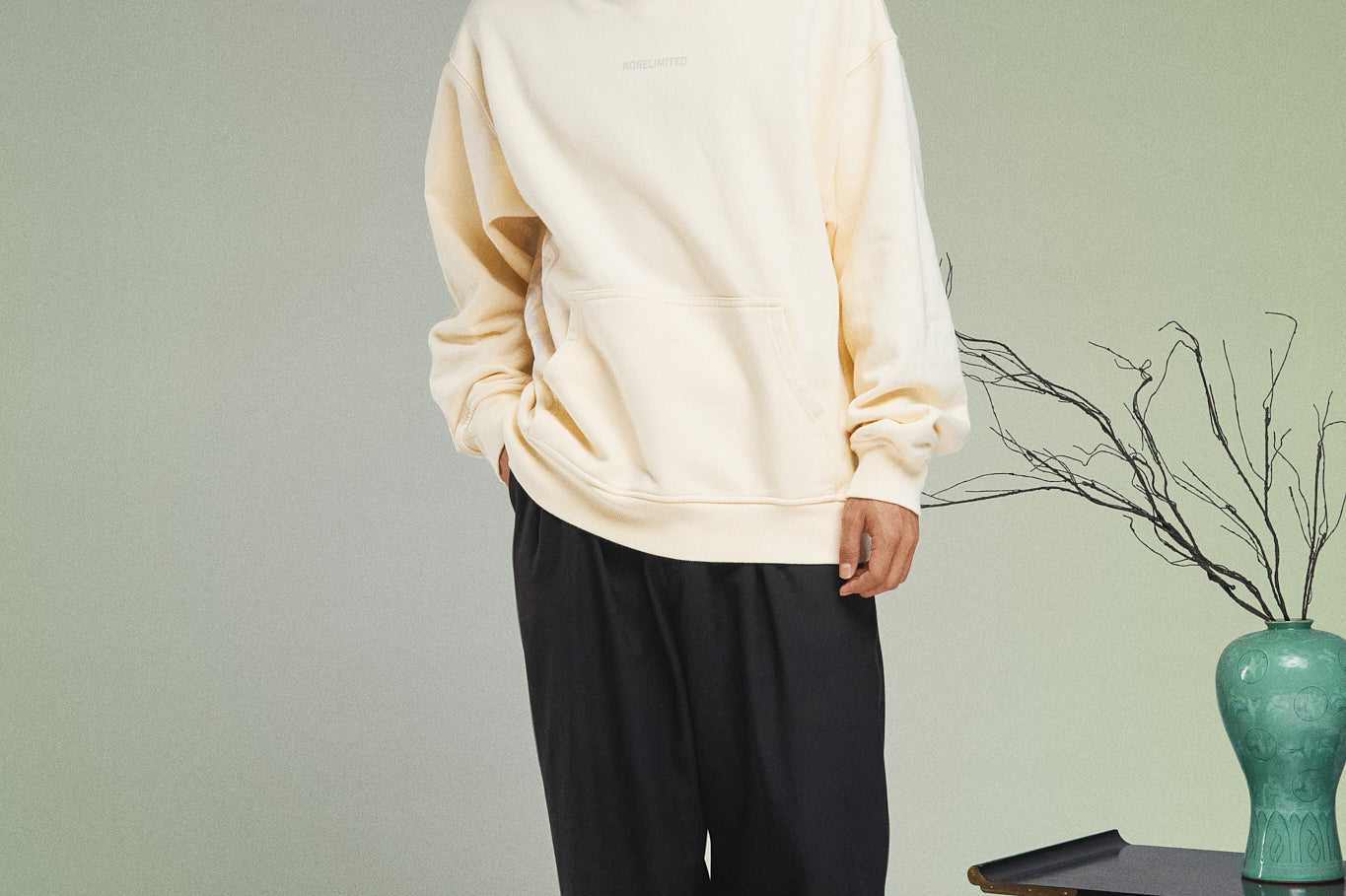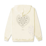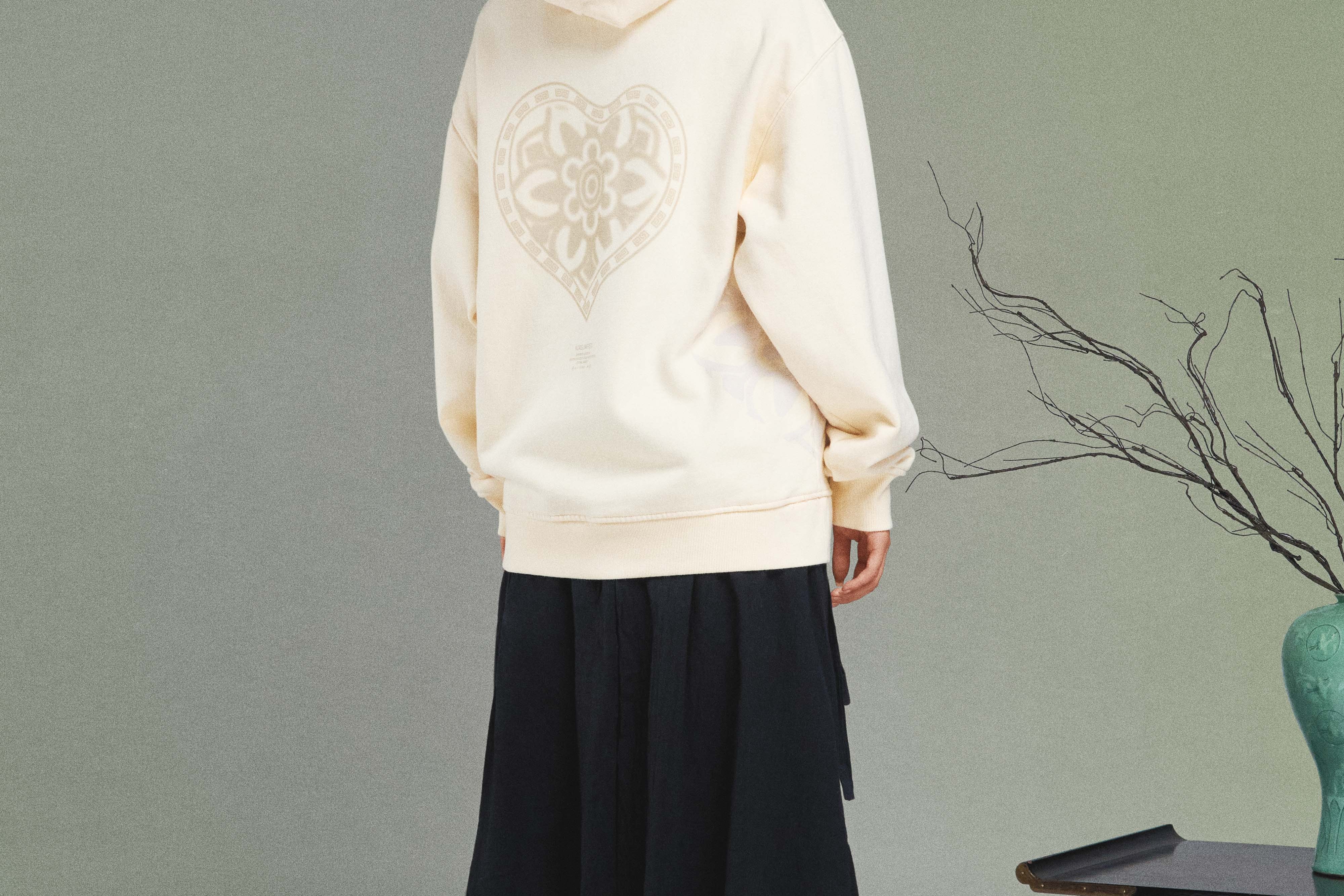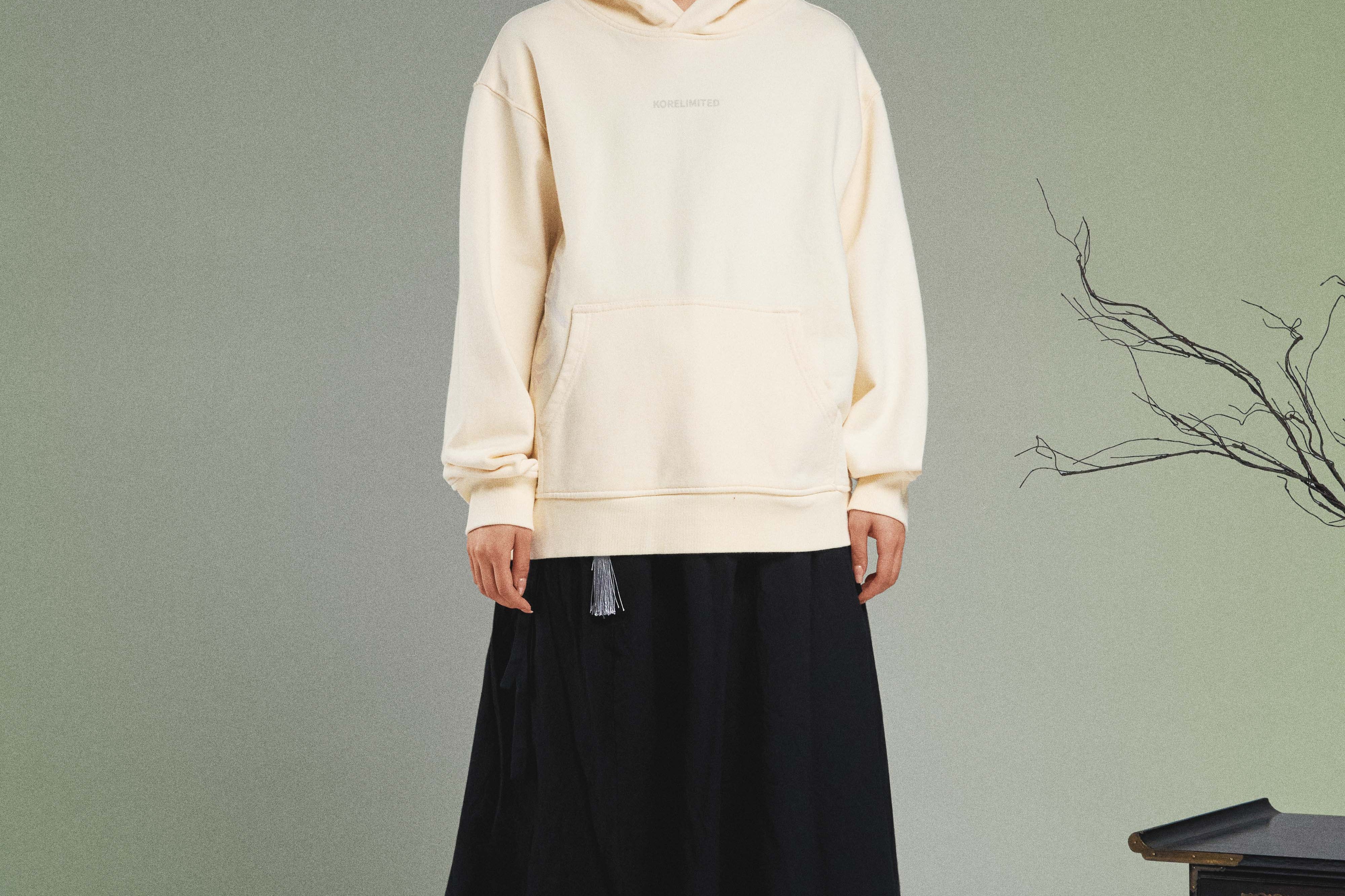 The KORELIMITED Hidden Heart Hoodie in Cream features the signature 'KORELIMITED' logo on the front and a striking heart design on the back and side front. With a traditional Korean motif inside the heart, this hoodie merges contemporary streetwear with cultural heritage. Available in Black as well