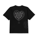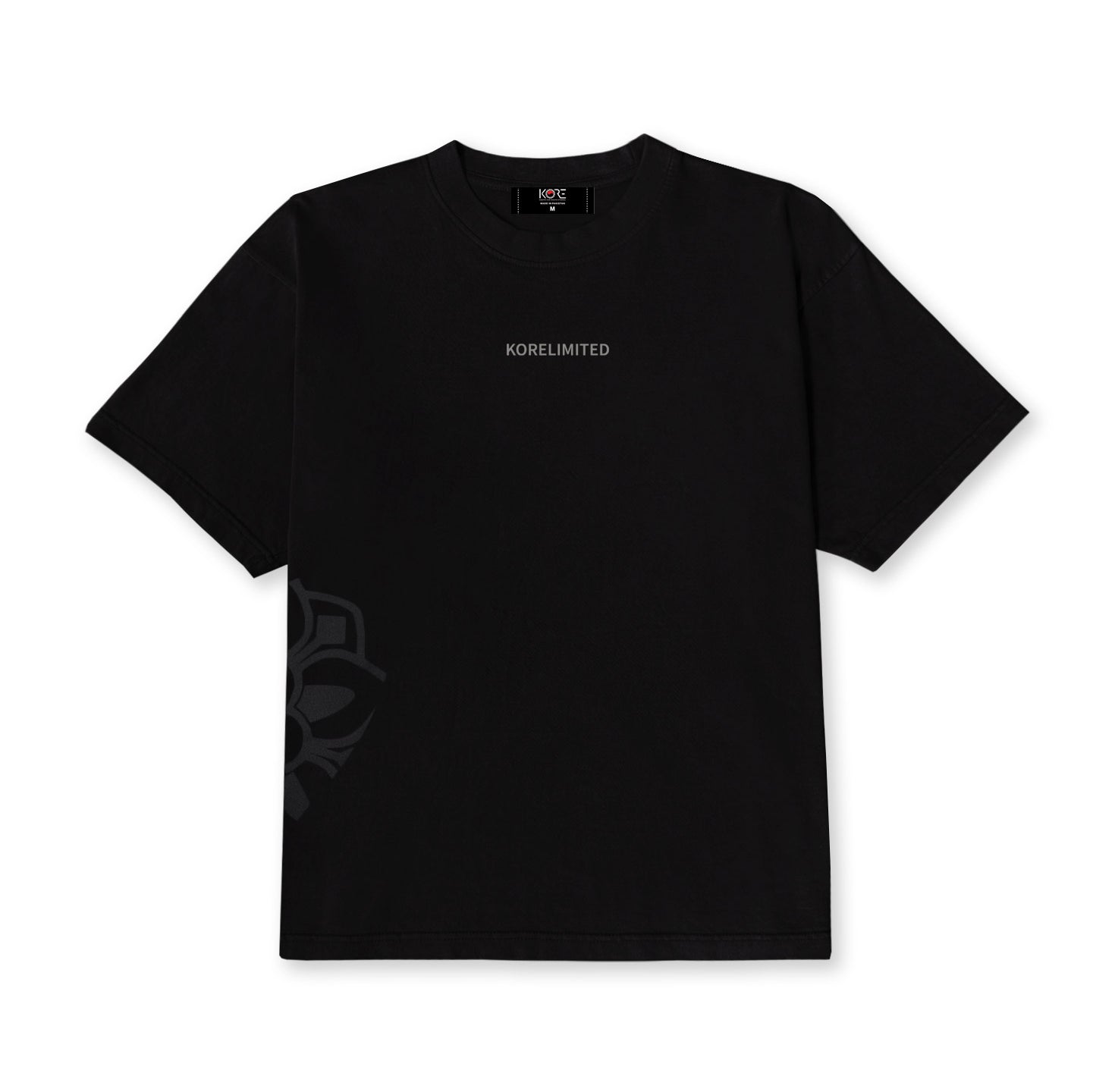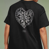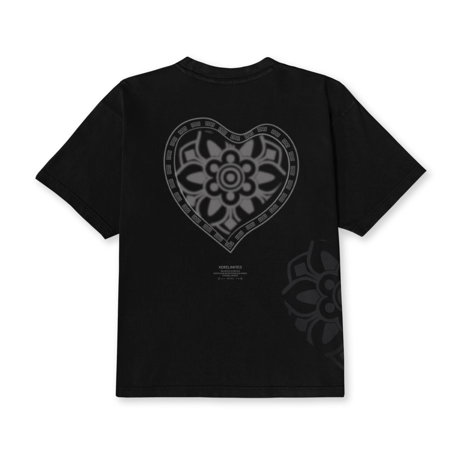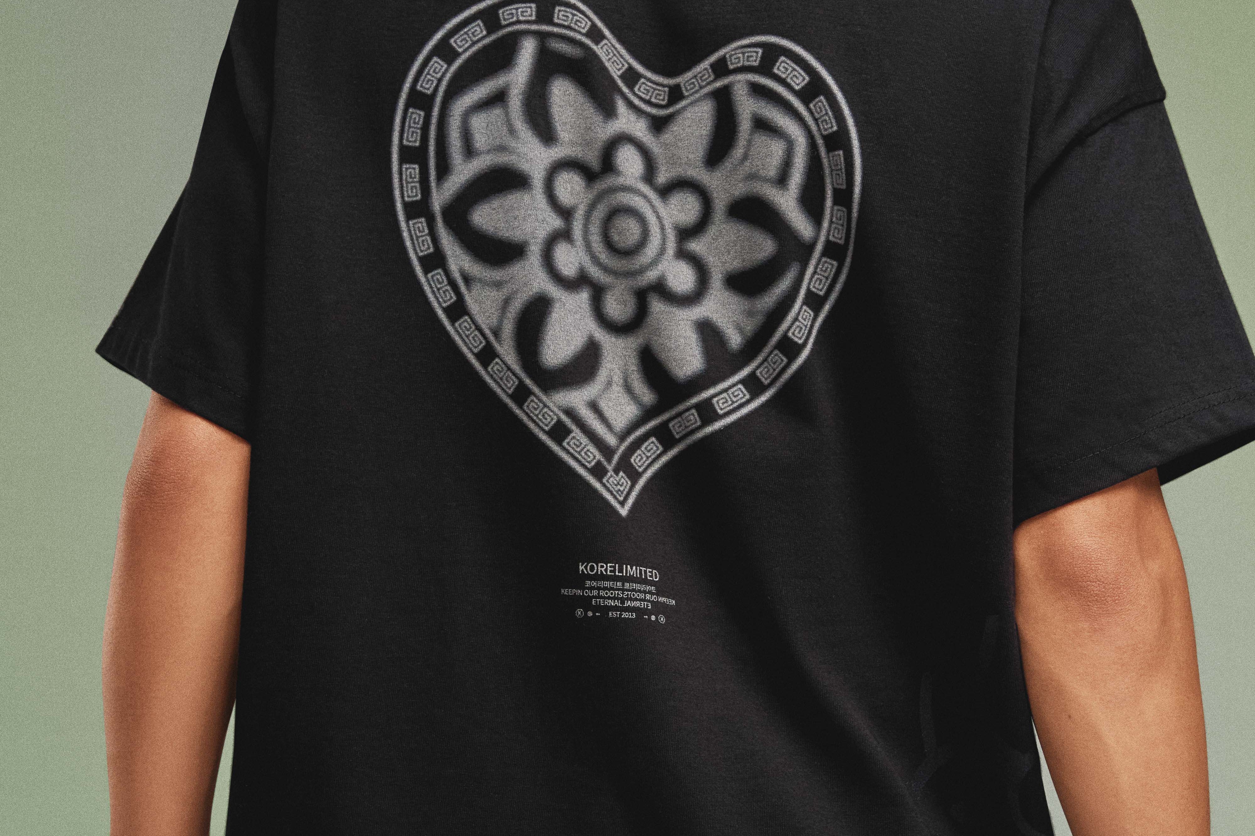 The Korelimited Hidden Heart Tee in Brown features the "KORELIMITED" brand name on the front, alongside the heart motif on the back and on the side front. The heart contains a traditional Korean motif, creating a unique streetwear look that honors timeless heritage. Also available in Black.