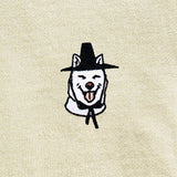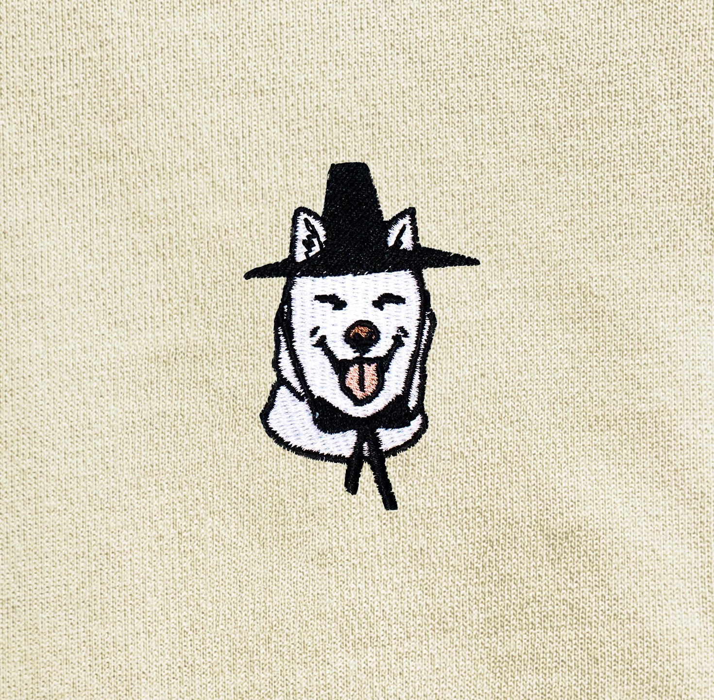 The KORELIMITED Joseon Jindo JJ Hoodie in cream pairs minimalist design with cultural flair. Featuring a playful embroidered face wearing a traditional Korean gat, this premium 12 oz heavyweight tee offers a soft, durable feel and a clean, fashion-forward look perfect for everyday wear