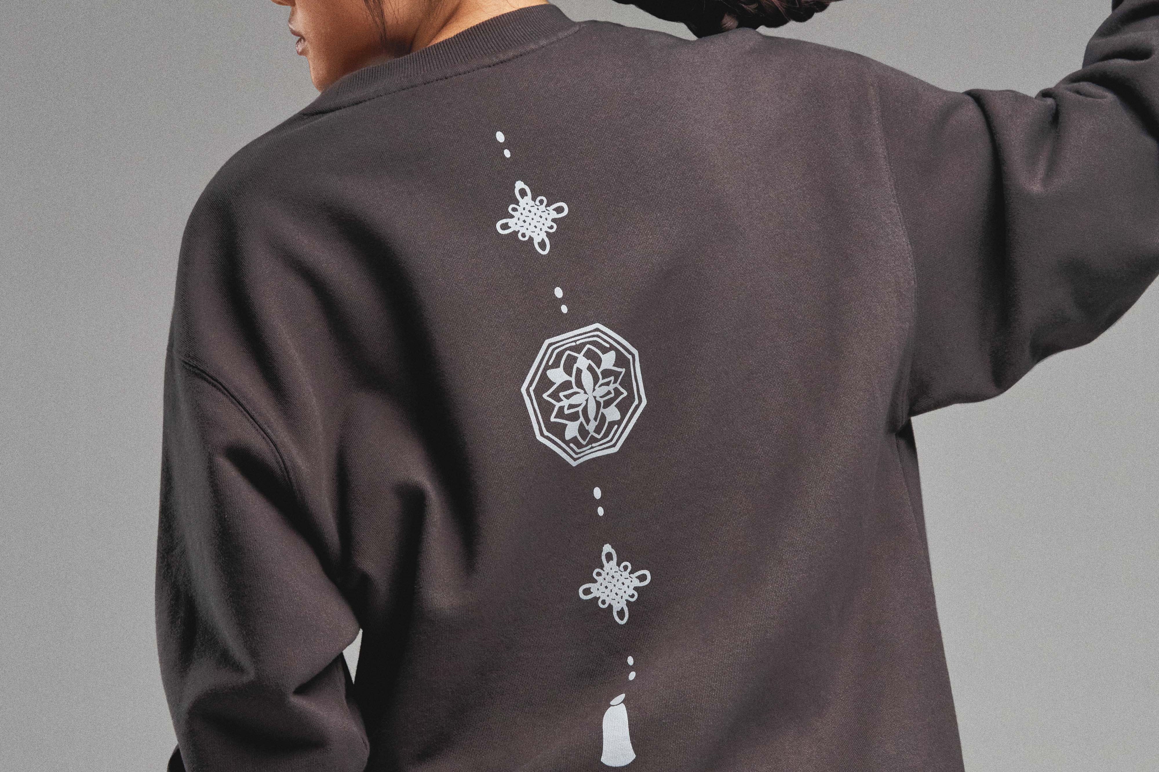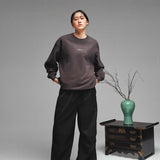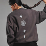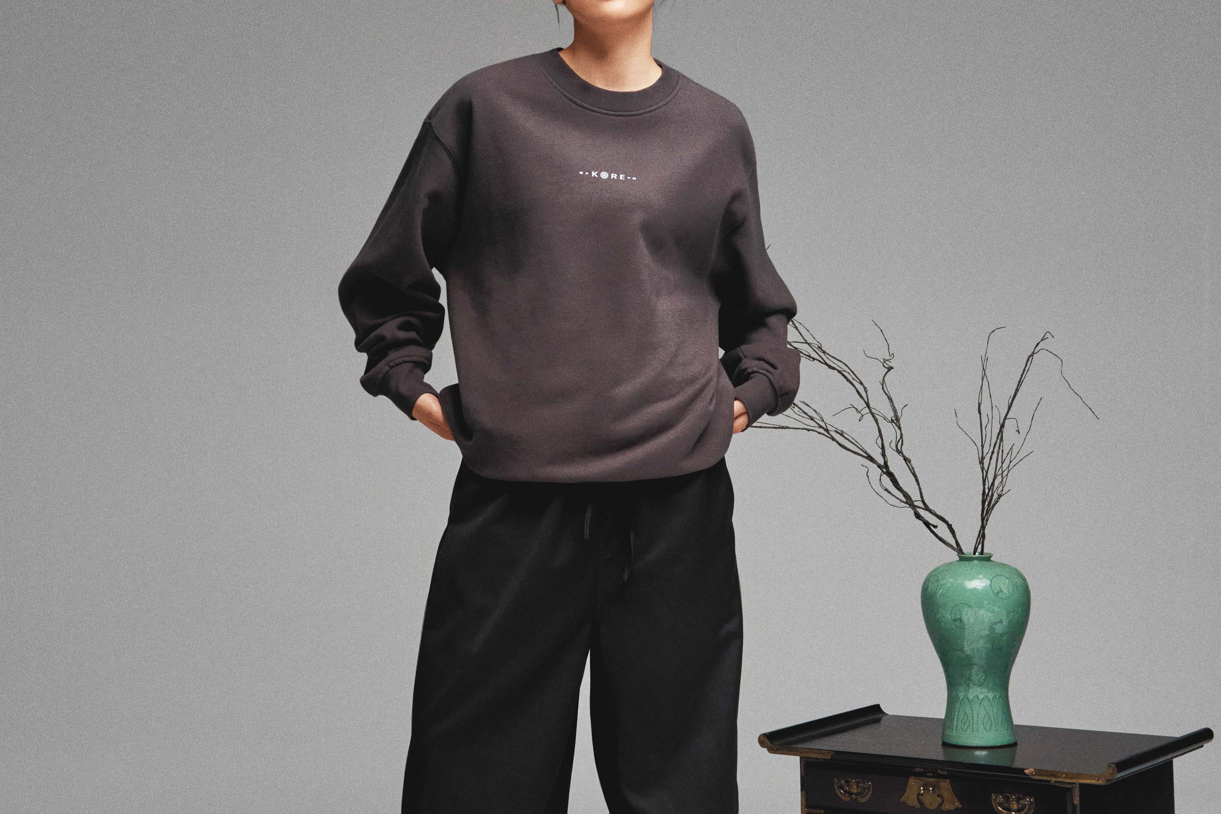 The Norigae Tattoo Crewneck in Shadow features a bold "KORE" branding on the front and an intricate Korean Norigae-inspired tattoo graphic on the back. This crewneck offers a unique blend of heritage art and contemporary fashion. Elevate your wardrobe with this meaningful piece.