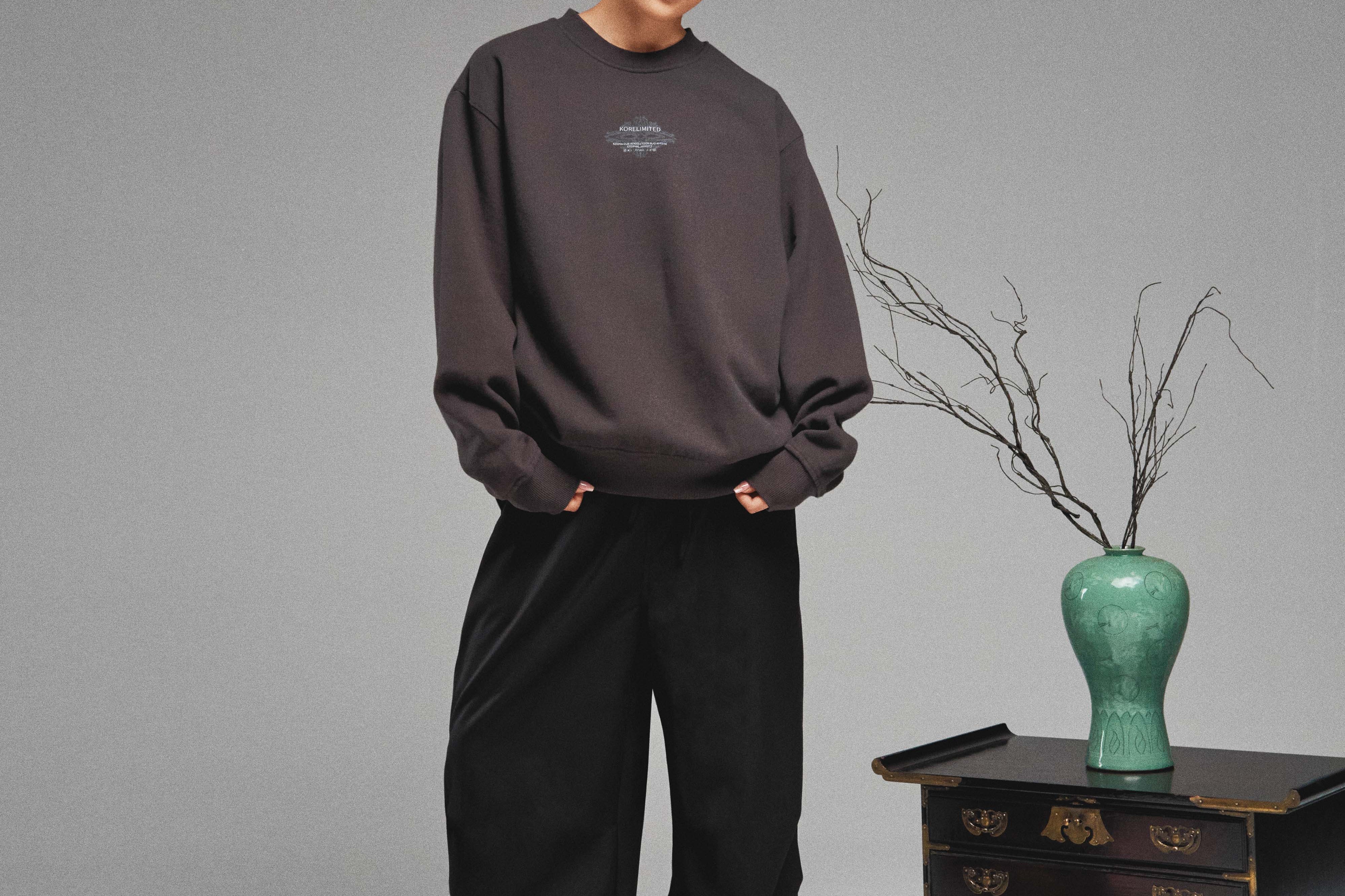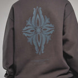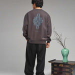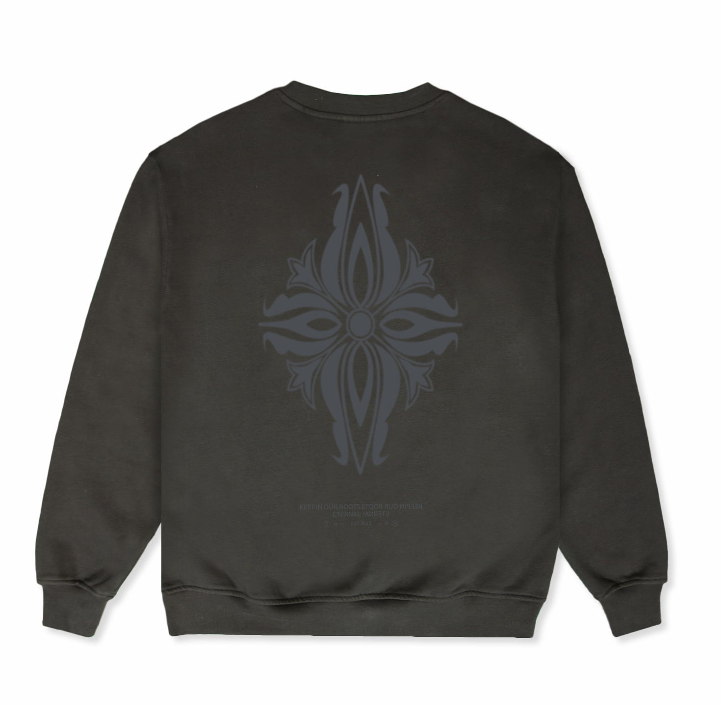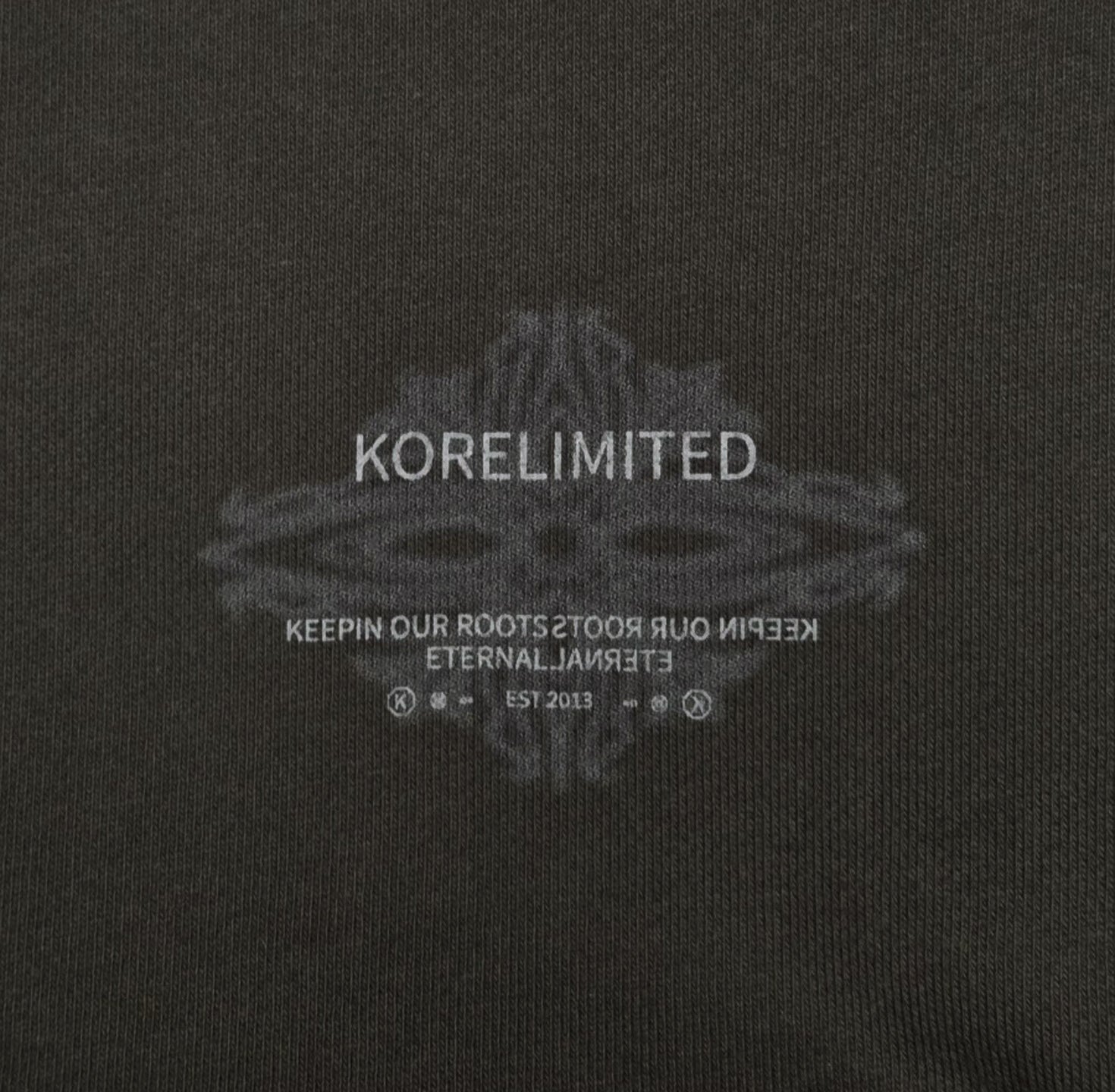 The KORELIMITED Taepyeong Flower Crewneck in Shadow showcases the Taepyeong flower, a Korean emblem of peace and harmony, on the front and back. Complete with the 'KORELIMITED' logo and motto 'Keepin Our Roots Eternal / 영원한 뿌리,' this crewneck blends cultural heritage with modern streetwear flair.