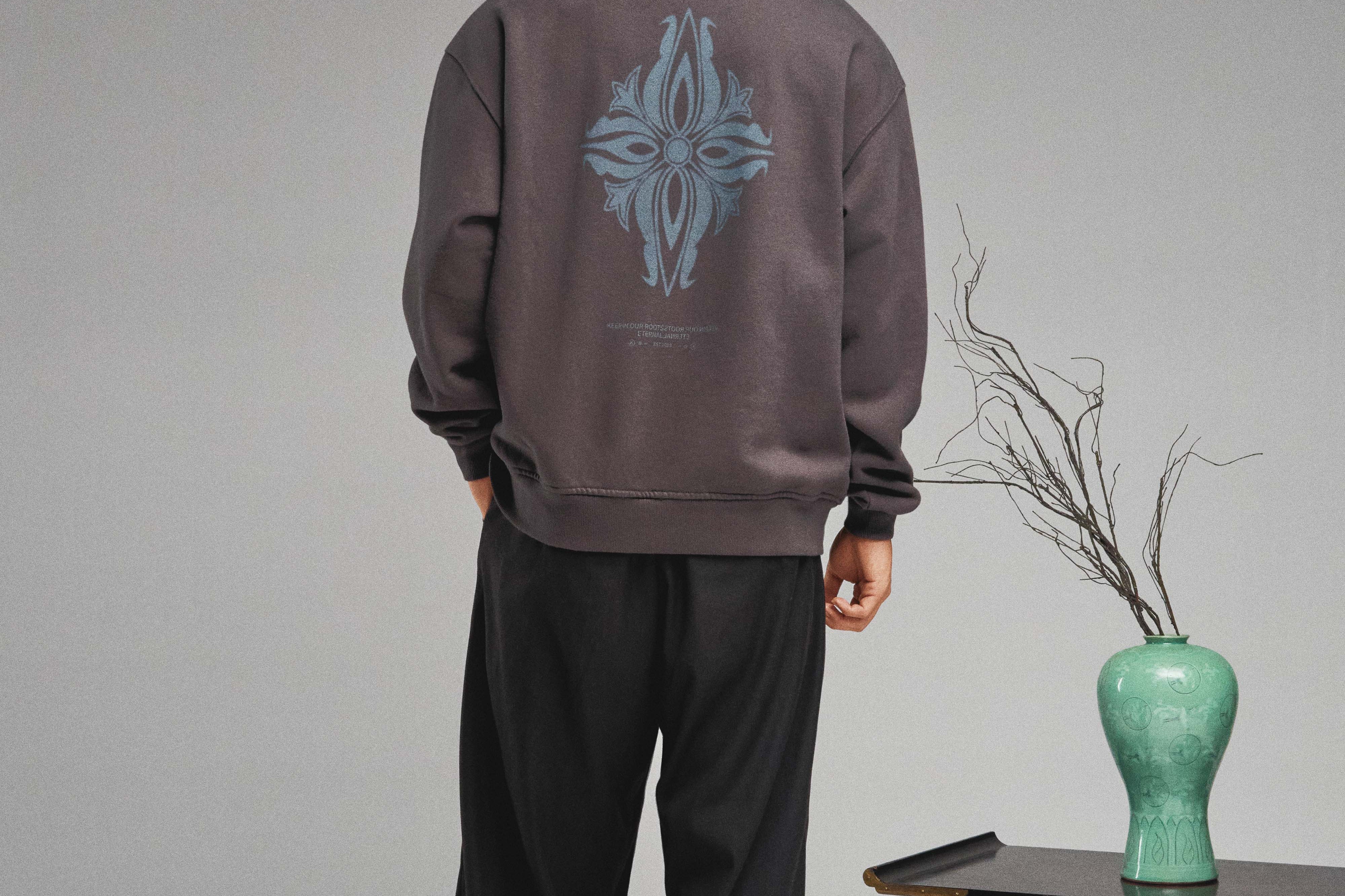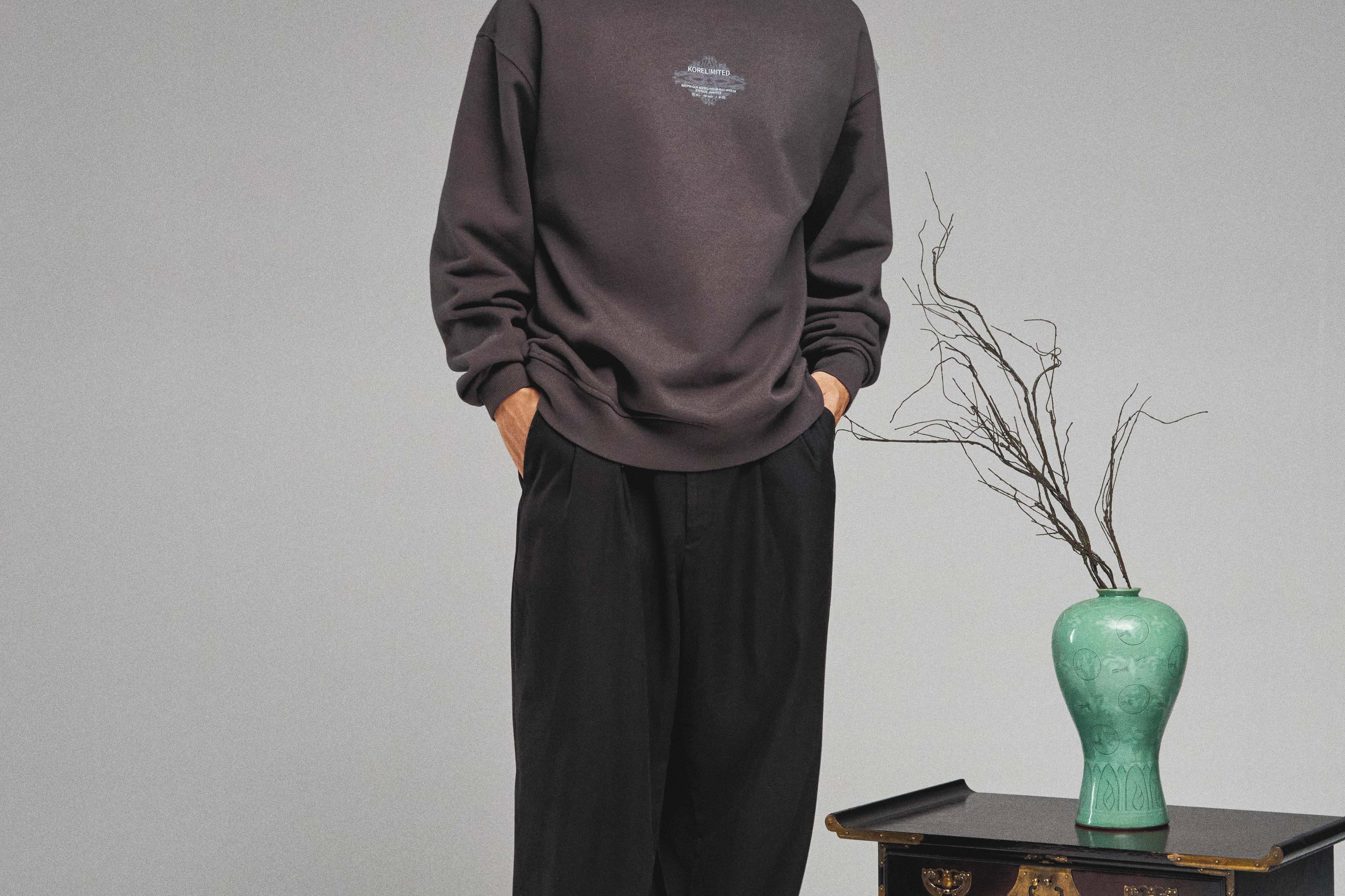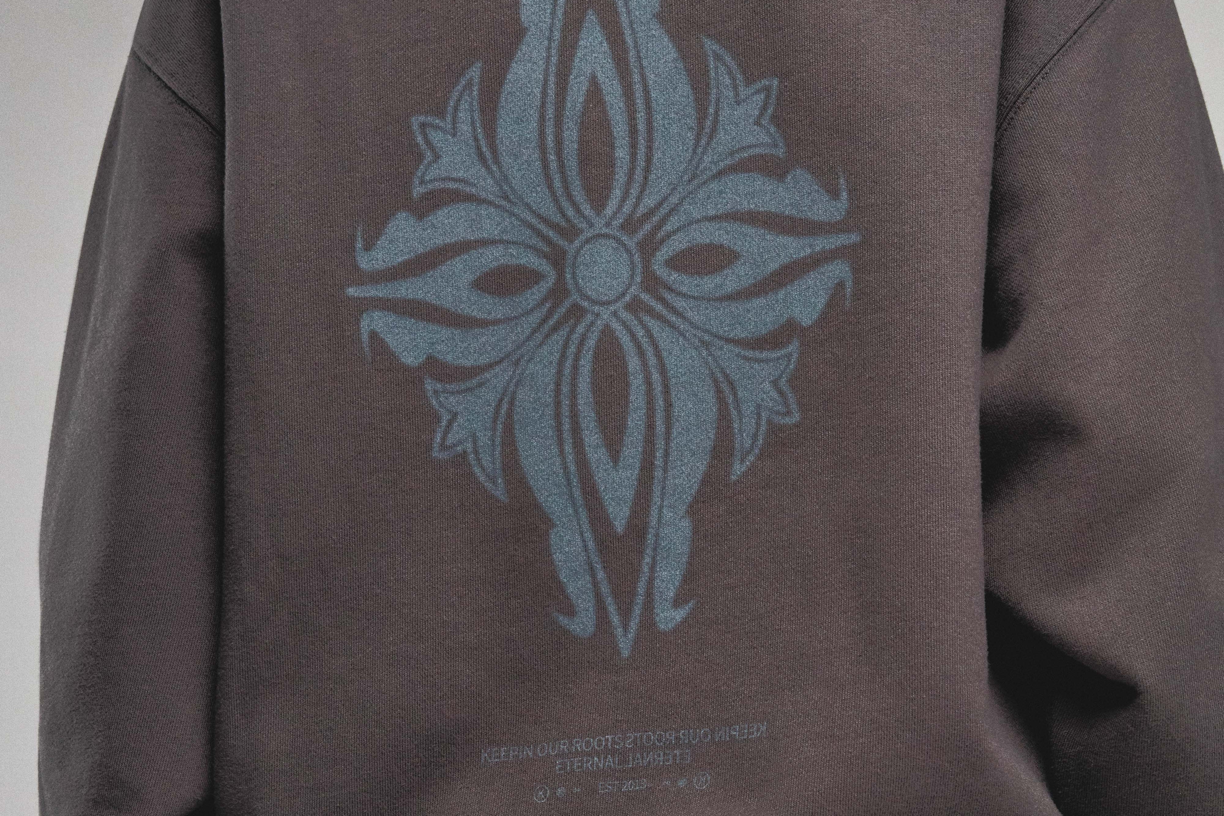 The KORELIMITED Taepyeong Flower Crewneck in Shadow showcases the Taepyeong flower, a Korean emblem of peace and harmony, on the front and back. Complete with the 'KORELIMITED' logo and motto 'Keepin Our Roots Eternal / 영원한 뿌리,' this crewneck blends cultural heritage with modern streetwear flair.