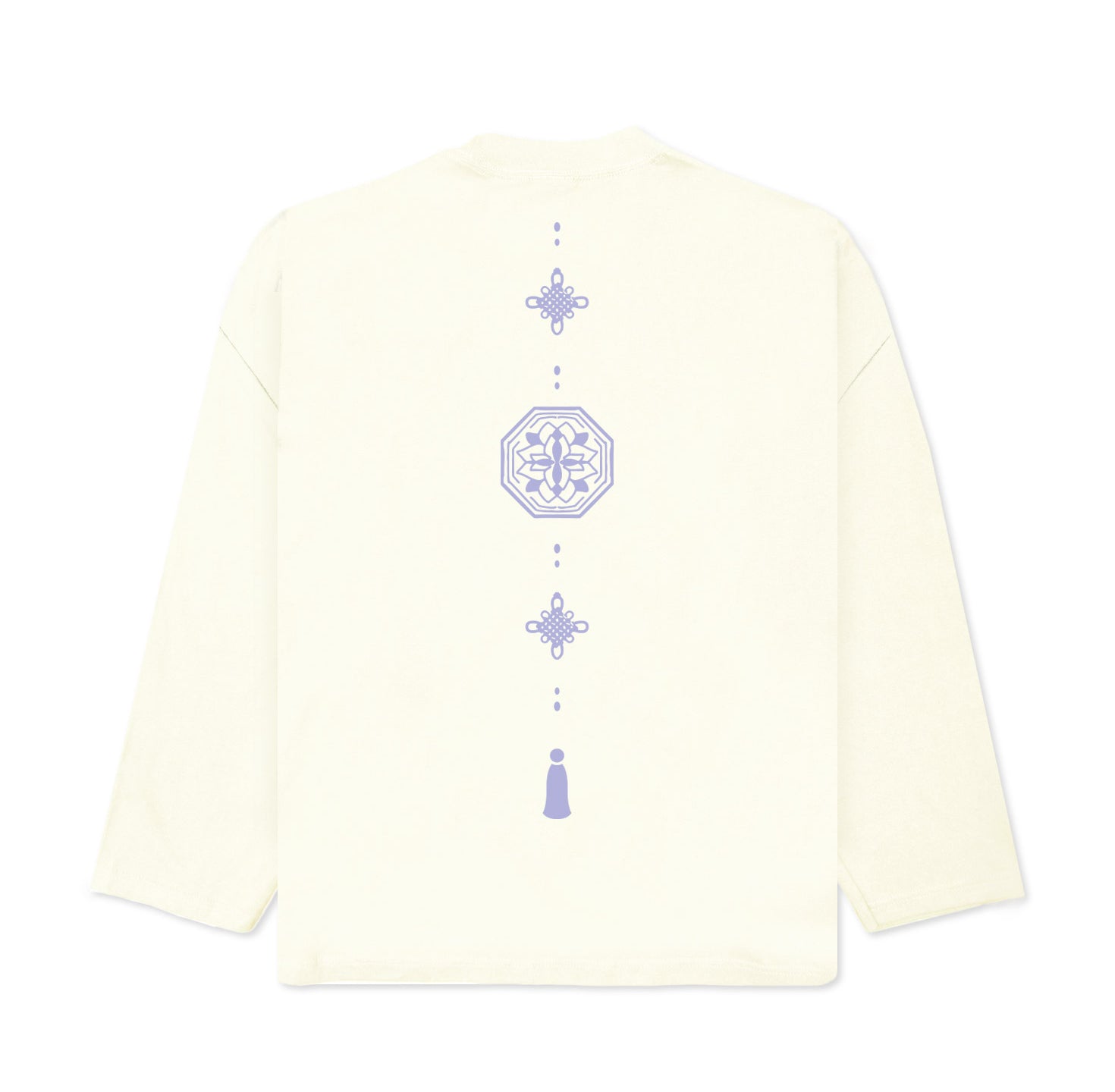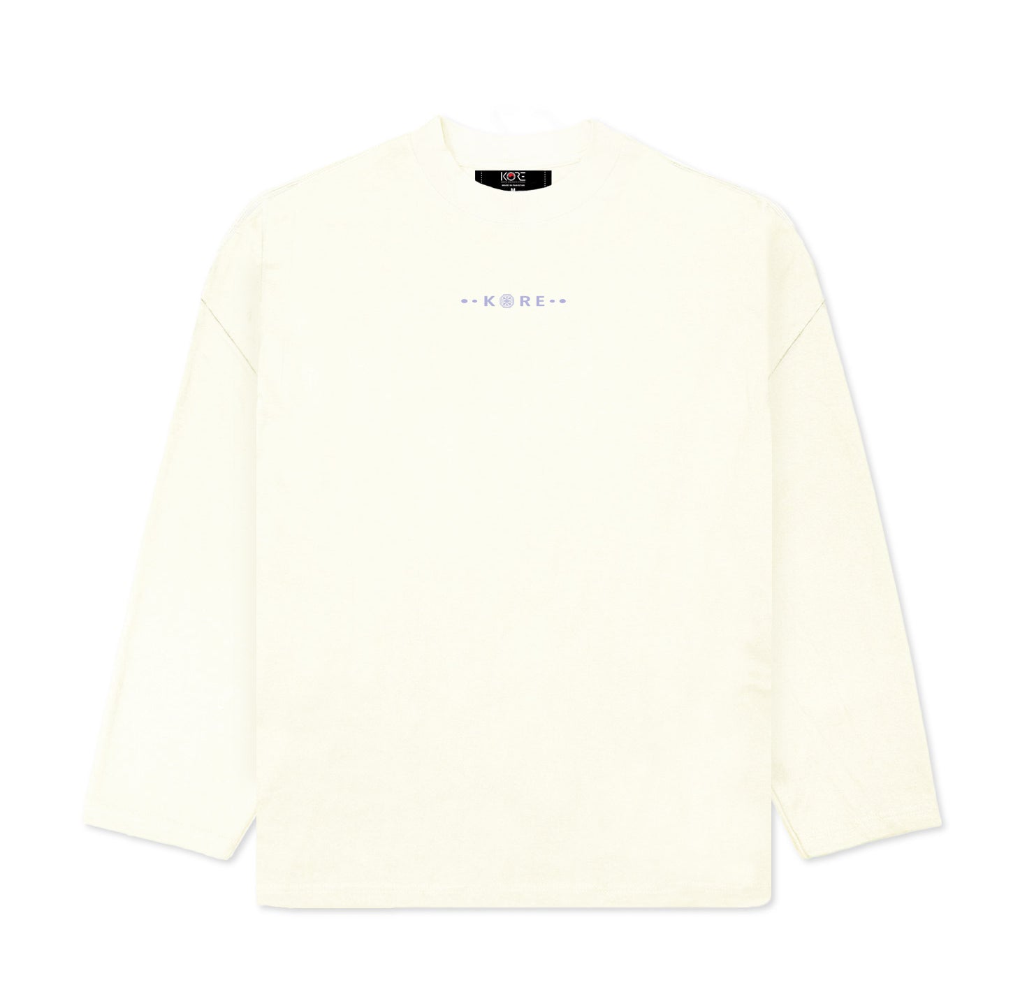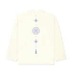 The KORELIMITED Norigae Tattoo Long Sleeve in Off White displays bold 'KORE' branding on the front and a detailed Norigae-inspired tattoo design on the back. Combining traditional Korean artistry with modern streetwear, this crewneck brings cultural heritage to your everyday style.