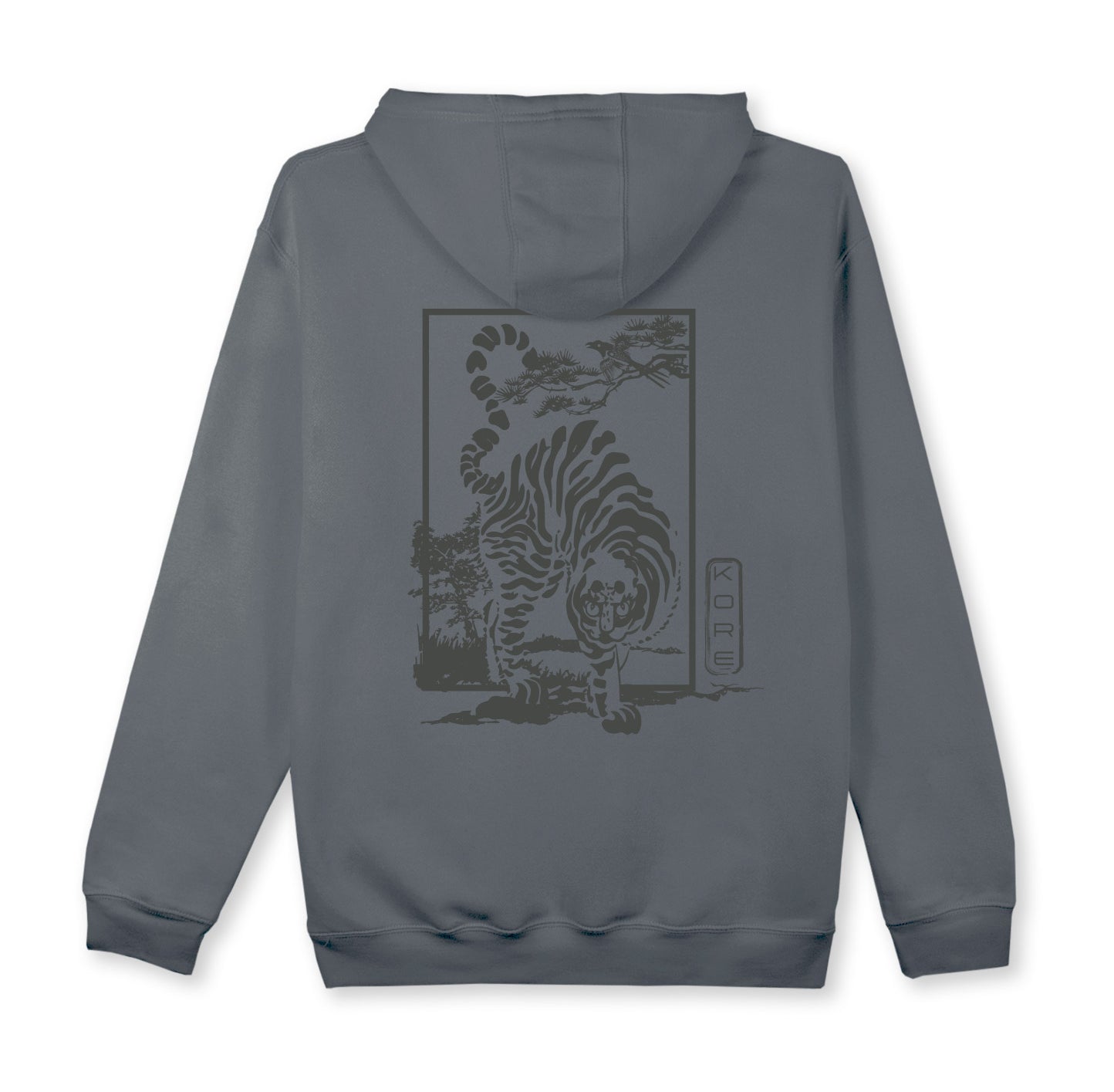 This Tiger & Magpie Hoodie in Shadow the harmony of power and positivity, the Tiger & Magpie Tee showcases a timeless Korean pairing. The tiger symbolizes fearless strength, while the magpie brings luck and uplifting energy—uniting to create a design rooted in culture, resilience, and good fortune.