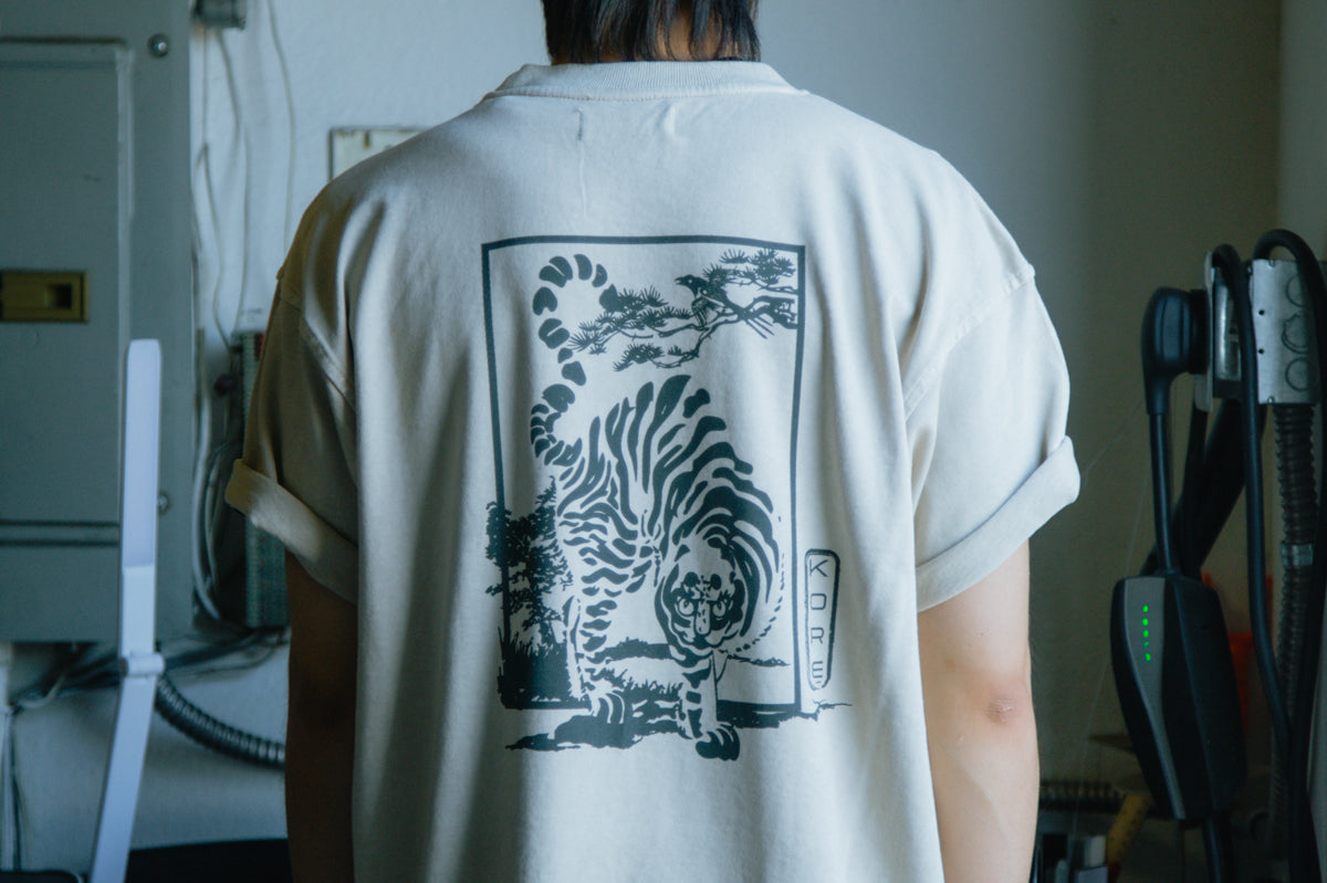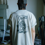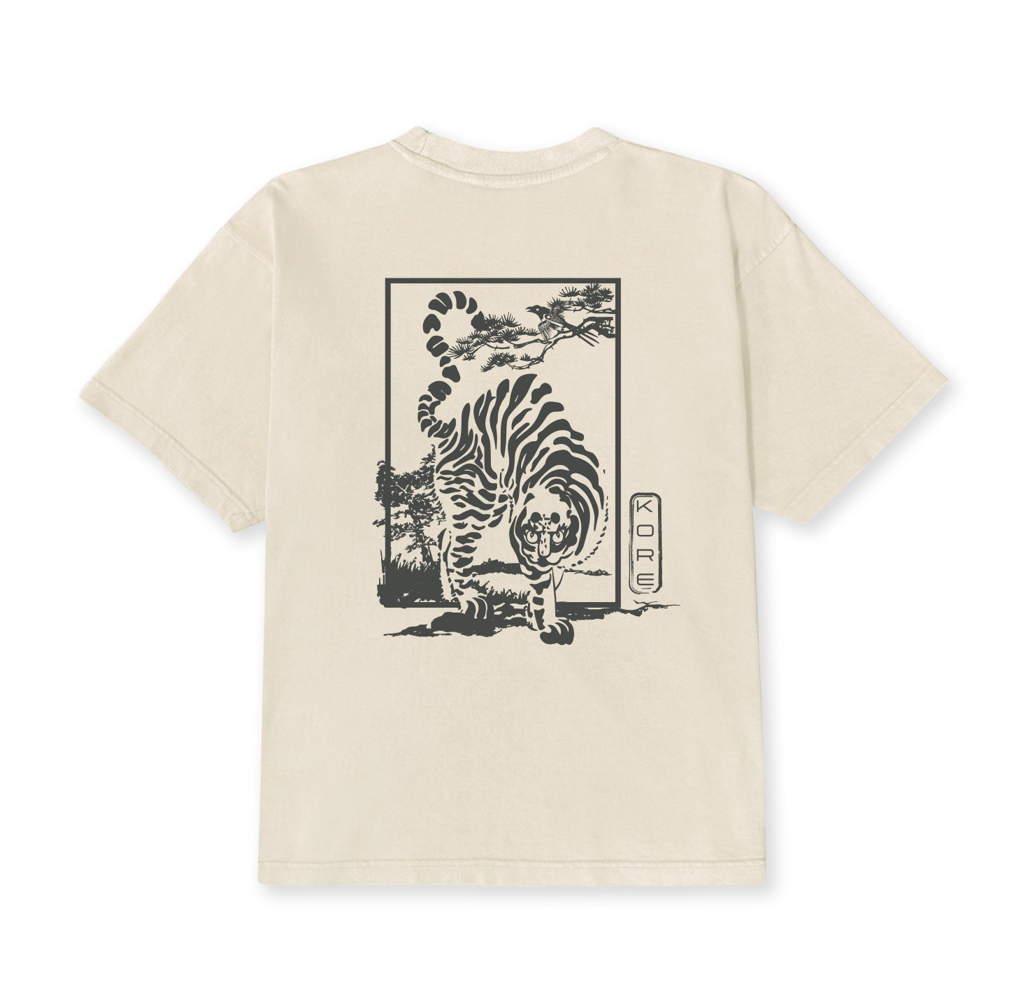 Drawing inspiration from the rich symbolism of the tiger and magpie, the Tiger & Magpie Tee merges strength and happiness. The tiger stands for resilience, and the magpie represents prosperity—together they create a dynamic and powerful narrative in every design. Also available in Washed Pink, Washed Green, Washed Khaki, and Cement.