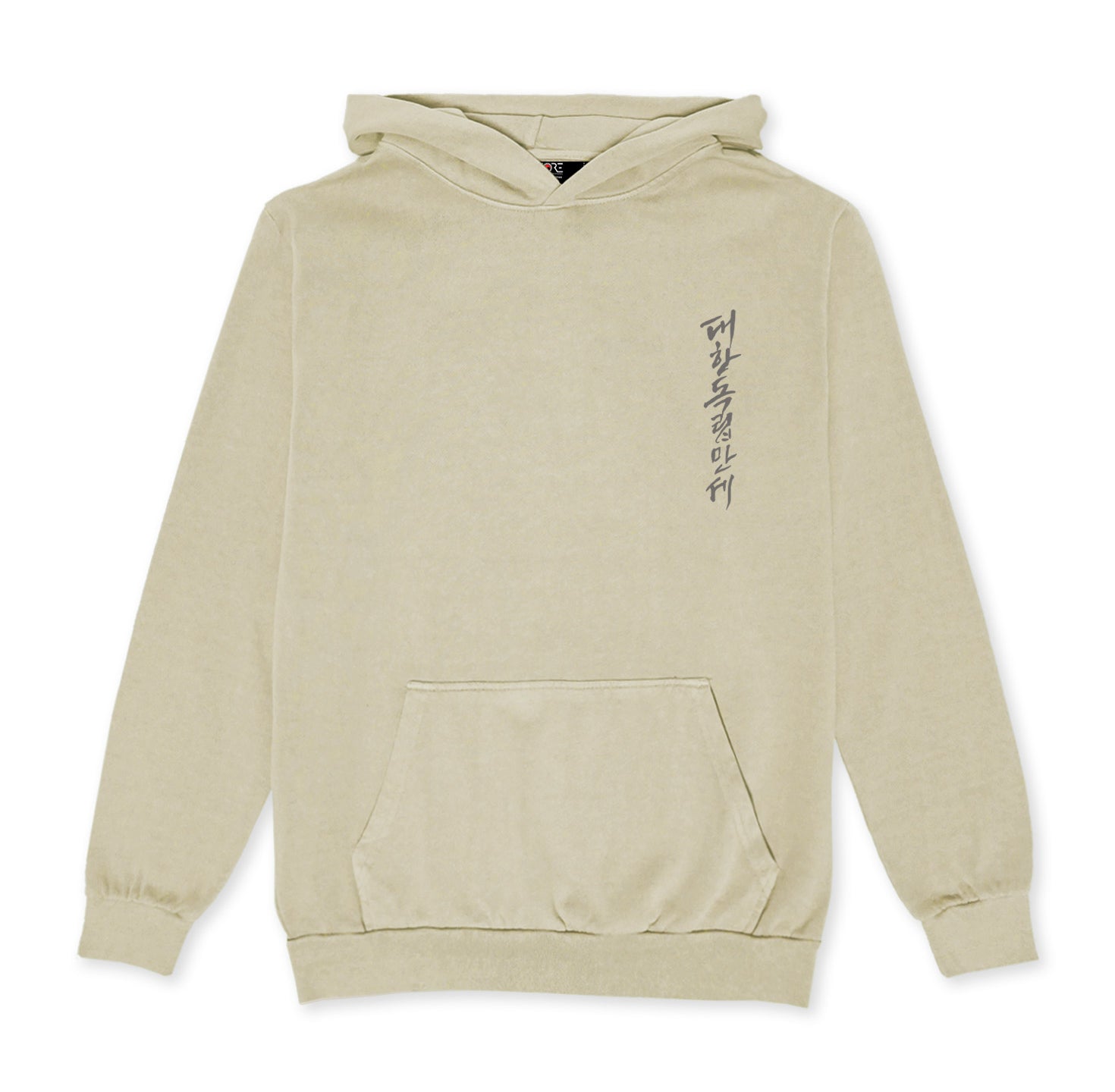 Vintage-style hoodie celebrating Korea’s Liberation Day. The back features an old Taegeukgi print, while the front displays “대한독립 만세”(Long live Korean independence) in a classic Korean font, evoking the spirit of 1945.
